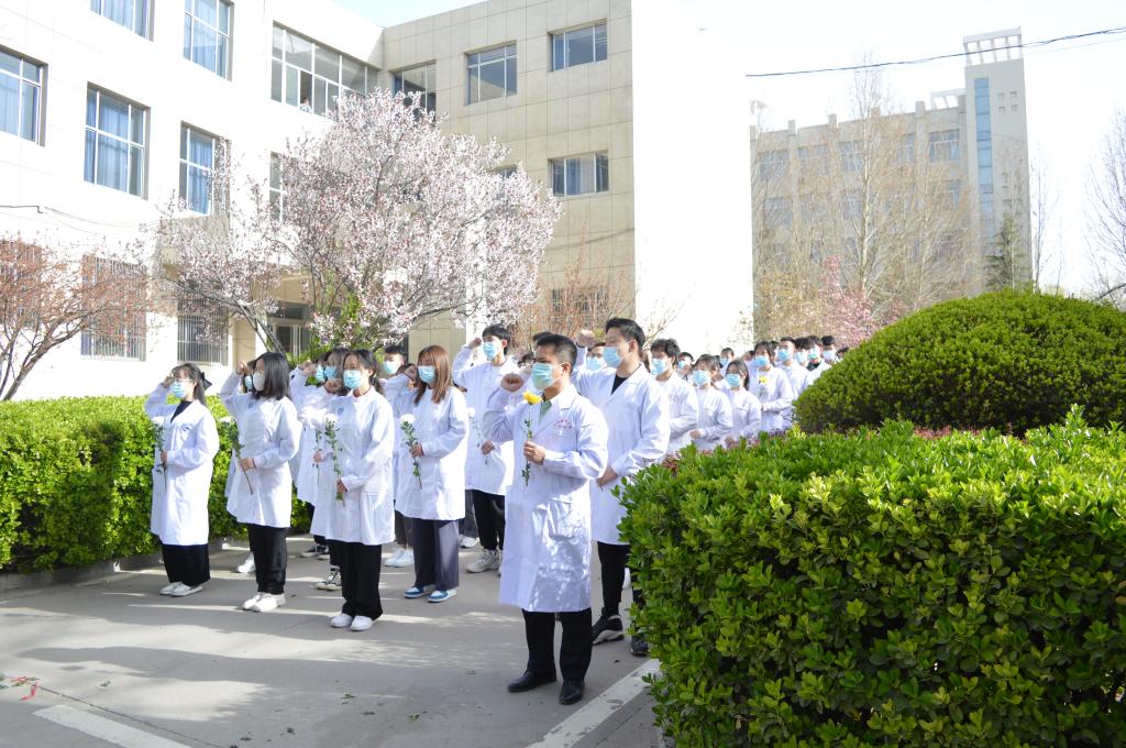 “健康所系,性命相托”已不再是一个口号,而是一项使命,一份责任。全体师生在国旗护卫队的带领下,重温医学生誓言,并怀着沉重的心情在纪念碑前献上手中的菊花,集体默哀三分钟,向不朽的英魂致以崇高的敬意。