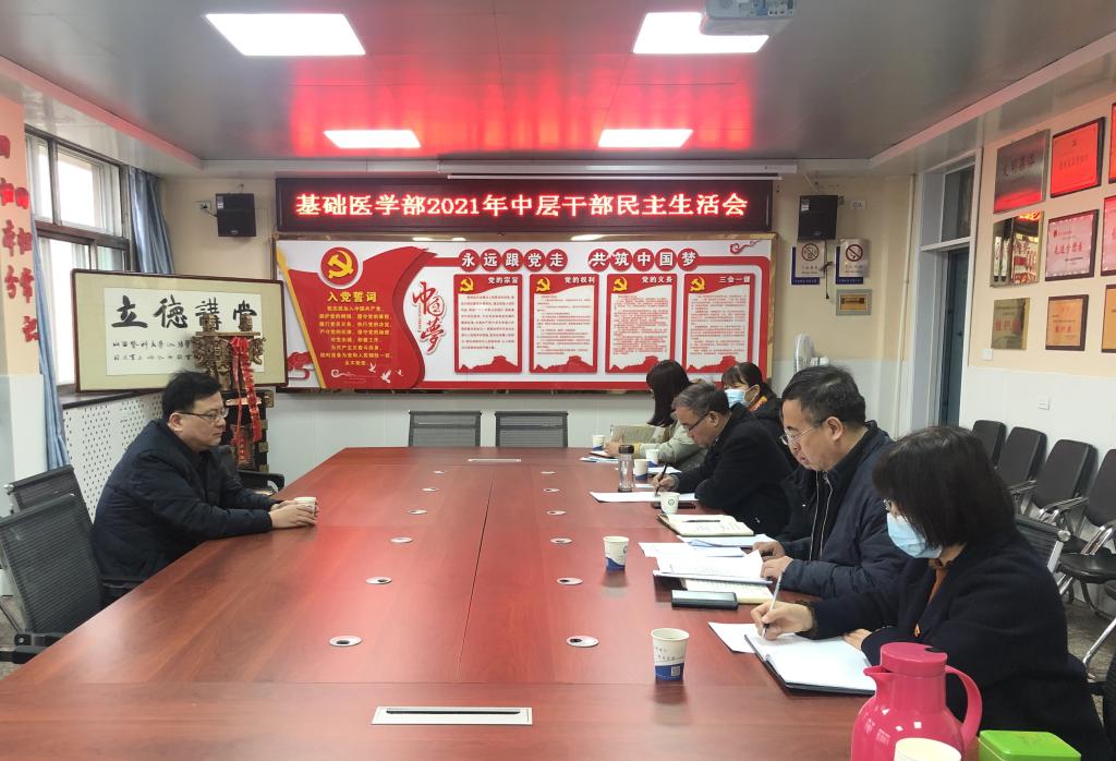 根据《中共山西医科大学汾阳学院委员会关于开好 2021 年中层处级党员领导干部党史学习教育专题民主生活会的通知》(山医大汾院党字(2021121号)的精神,16日上午10时,基础医学部党总支在诚明楼四楼会议室召开系部班子党史学习教育专题民主生活会。会议由党总支书记姚万军主持,基础医学部全体班子成员参加,第三、第四党支部书记和组织员列席。基础医学部联系领导、校党委副书记、院长孟小平到会督导。