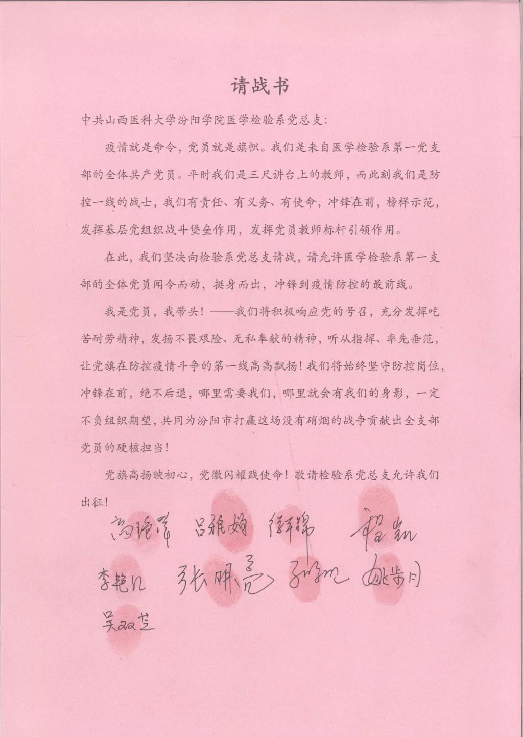 随后,一支部书记高艳萍郑重地将请战书交到系党总支书记李元宏的手中。一份按满红手印的请战书、质朴坚定的签名、铿锵激昂的话语,传递的是他们坚定的信仰,向党总支请战!若有战,召必应,战必胜,定不辱使命!