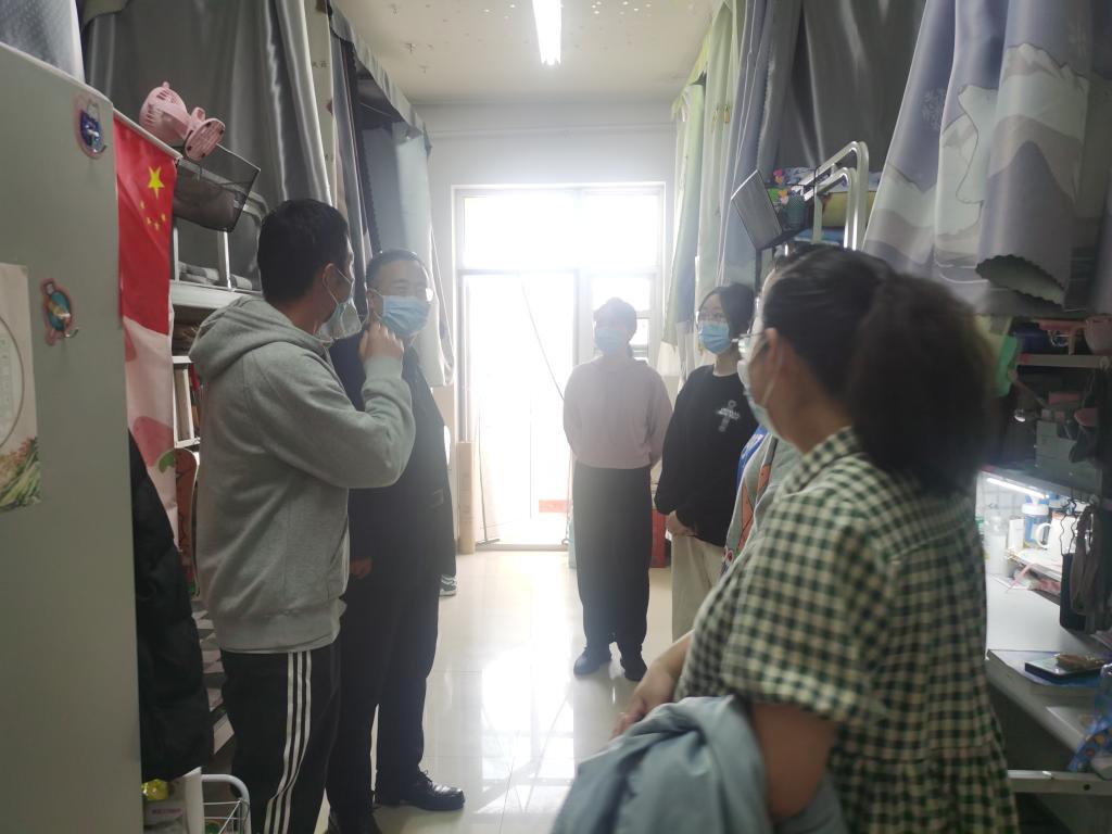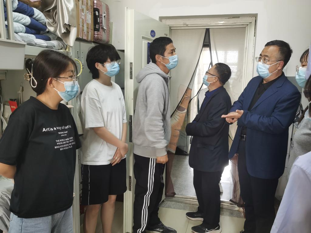领导们逐一走访了3号和5号学生公寓520班级的宿舍,与同学们进行了亲切的交谈。两位领导重点检查了学生宿舍卫生、通风和防疫情况,给同学们详细介绍了学校的防疫政策和疫情期间学校的系列暖心活动,叮嘱同学们要遵守学校的疫情防控政策,按照学校要求认真完成每日企业微信打卡,切实做好个人防护,戴口罩、勤洗手、少聚集、多通风,保证宿舍的干净整洁,营造安全、健康的生活环境。