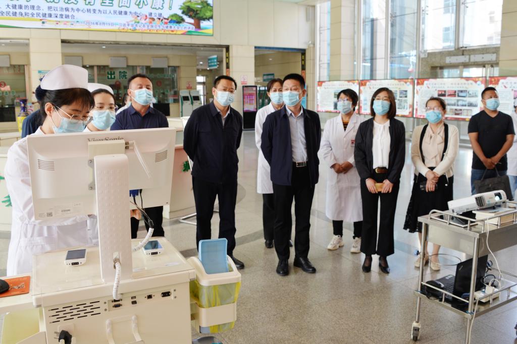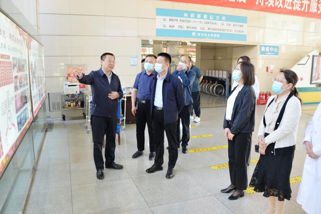 闫敬来书记一行在孝义市副市长杨凤鸣、孝义市人民医院院长张宏的陪同下参观了孝义市人民医院门诊大厅、重症室等科室。张宏院长详细介绍了医院医疗设备信息化、学科人才队伍等情况。随后,双方进行了亲切的座谈。