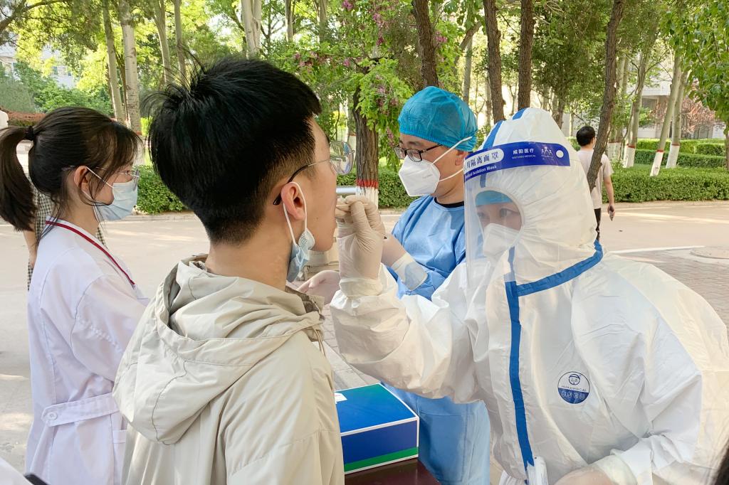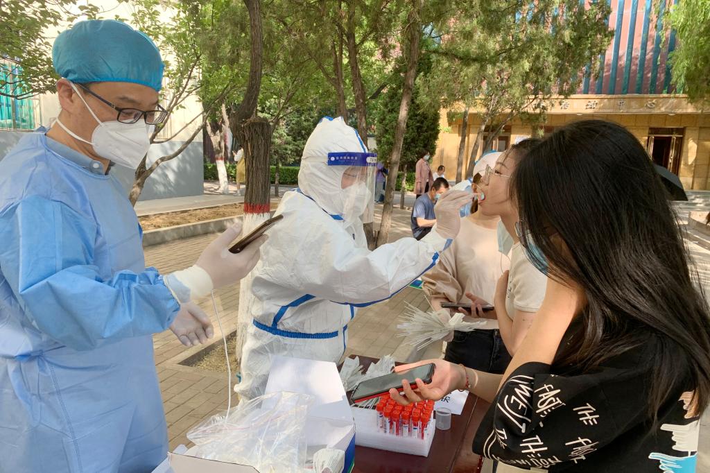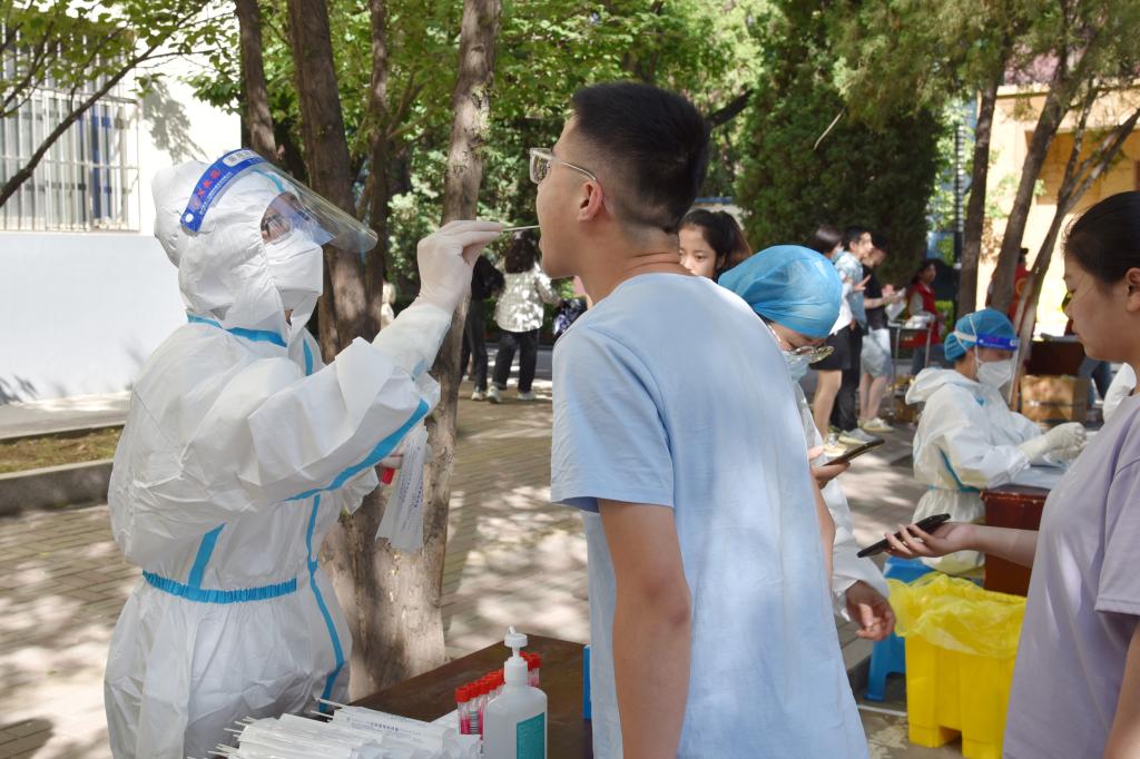 后来是安排校内志愿者的核酸检测任务。因种种原因,汾阳医院的核酸检测人员难以派出,从5月5日起学校立即抽调各系部组成核酸检测队伍,先后有65名志愿者参与了核酸检测工作。65名志愿者中,有系部的副主任,有50多岁的研究生导师,也有刚刚参加工作的年轻老师们……