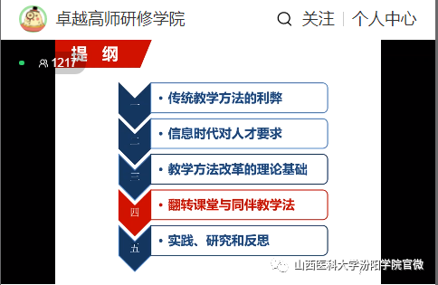 来自北京师范大学、上海交通大学等名校的专家围绕教学方法、教学创新、教学设计、学习评价和虚拟教研五个方面展开了精彩的讲授。张萍教授在《基于翻转课堂的同伴教学法》讲座中系统分析了传统教学方法的利弊,提出了新时代教师发展和人才培养的新要求和重要使命,就是培养具有创新能力与合作精神的人才。许亮教授在《信息化背景下教学创新设计的思考与实践》讲座中讲授了信息化BYOD教学手段的合作学习模式与科学评价机制。周付安教授在《教学设计:从朴素经验到效能可期的三层跃迁》讲座中提出了教学设计对教材内容的重构和对学生从知识到能力与情感的跃迁。邱意弘教授在《学习评价:课堂学习效果评价》讲座中介绍了医学教育的评估框架和评估方法。信息化的教学手段催生了教研室这一基层教学组织的新变革。刘春凤教授在《虚拟教研:从大学数学课程建设到虚拟教研室建设的跋涉之旅》讲座中以华北理工大学大学数学课程群虚拟教研室的构建为范例,介绍了虚拟教研室的建设理念与行动方案。