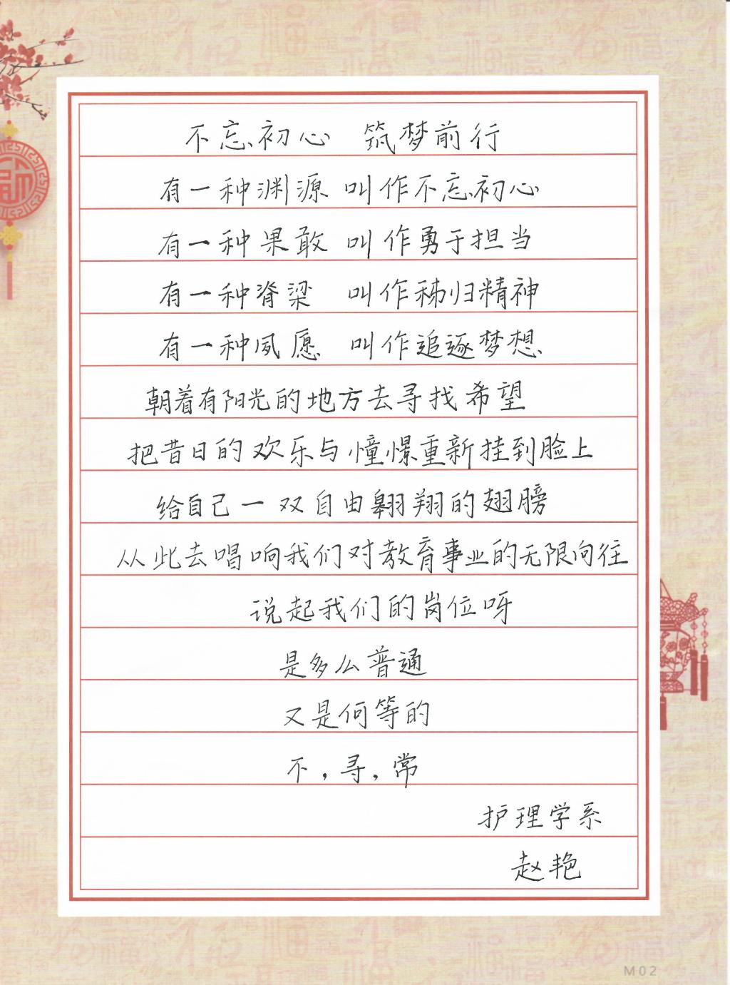 随风潜入深深夜,润物无声是良师。为进一步增强教职工凝聚力、战斗力和向心力,丰富教师文化底蕴,陶冶教师情操,展现天使团队教师风采。在第38个教师节来临之际,护理学系分工会在系部党政领导的支持下,举办了“培根铸魂育新人”为主题的教师硬笔书法比赛和团建拓展活动。