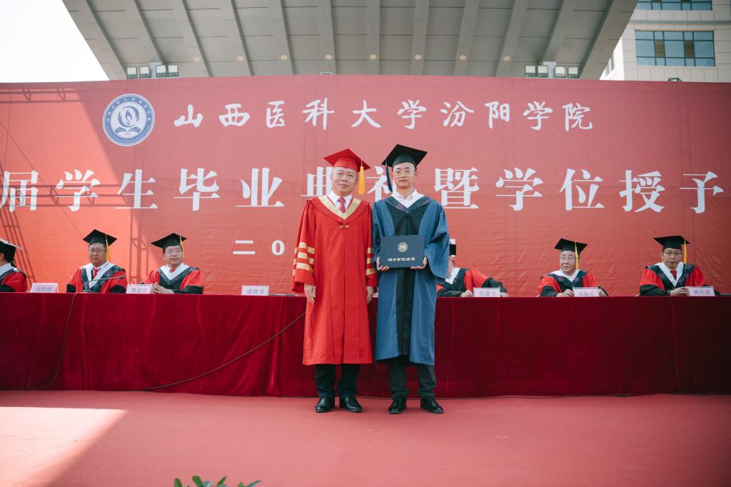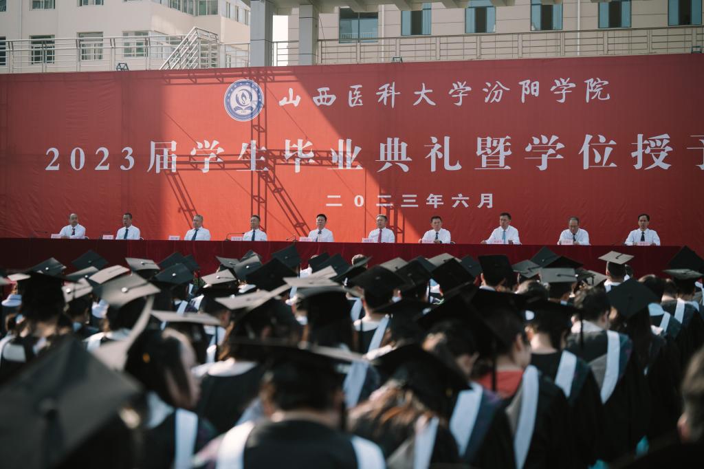 党委书记闫敬来致辞,代表学校向1998名本科生和30名硕士研究生顺利毕业表示衷心祝福,向悉心教导同学们的老师、辛勤抚育同学们的父母、关心帮助同学们成长的社会各界表示诚挚感谢。闫敬来书记与同学们一同回顾了在汾阳学院的成长经历,殷切嘱托同学们:一是要坚定信念,厚植爱国情怀。希望同学们胸怀“国之大者”,树立家国情怀,时刻牢记“请党放心、强国有我”的青春誓言,用坚定信念激扬奋斗精神,与祖国同向同行,在实现民族复兴的赛道上奋勇争先,自觉把人生理想融入国家和民族的事业中去,在实现“中国梦”的生动实践中放飞青春梦想,为实现“健康中国”不懈奋斗。二是要秉承校训,勇担医者使命。希望同学们在未来的日子里,时刻牢记“健康所系,性命相托”的医者誓言,秉承“仁术爱仁,精益求精”的校训,恪守“求真”的科学精神,遵循“求是”的医学规律,敬佑生命、救死扶伤、甘于奉献、大爱无疆,为祖国医药卫生事业的发展和人类身心健康奋斗终身。三是要修身立德,锤炼品格修养。希望同学们不断提升自身修养,锤炼厚德品格,不管顺境、逆境都要心怀希望,永远保持乐观豁达、淡定从容的心态,在千磨万击中愈加坚韧,在风雨兼程中行稳致远,永远做人生路上的追光者。