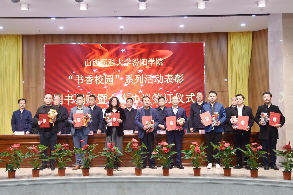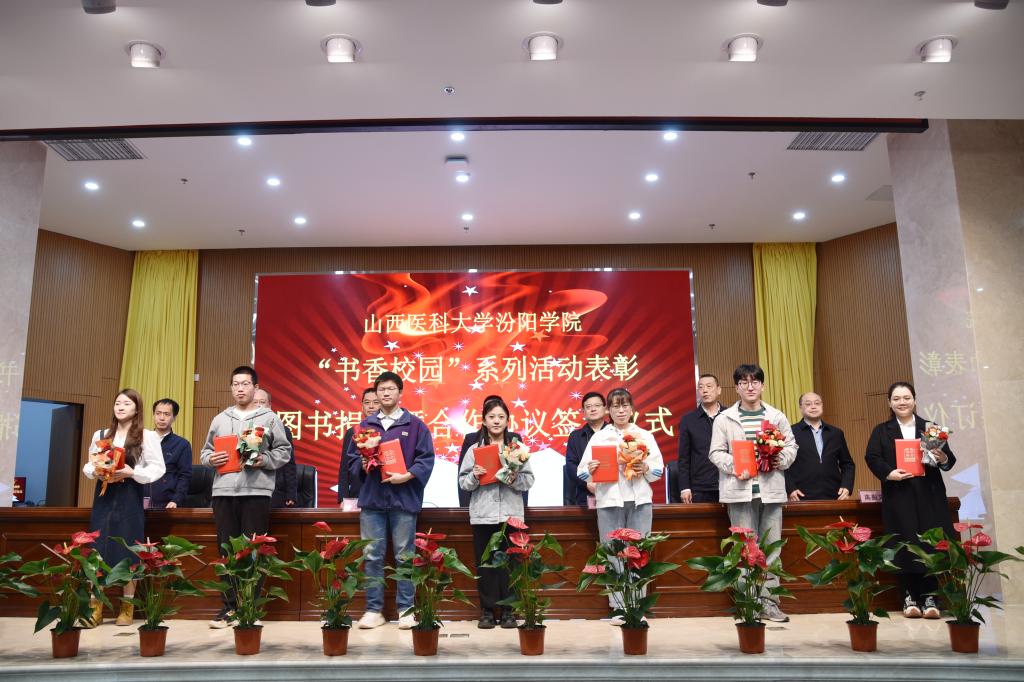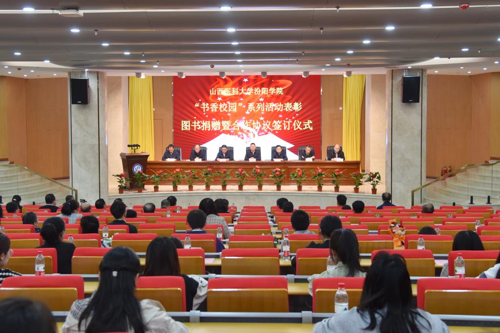 书香浸校园,大爱润心田。4月28日,世界杯官网在图书馆学术报告厅举行了“书香校园”系列活动表彰、图书捐赠暨合作协议签署仪式,汾阳市人民政府党组成员、副市长王宝启,汾阳市文化和旅游局局长杨丽春,汾阳市图书馆馆长姜幼平,山西冬青树贸易有限公司、汾阳市贾家庄裕和餐管公司、贾家庄村委、蔚蓝公益基金会等向世界杯官网捐赠图书的单位和个人代表莅临出席,世界杯官网党委书记闫敬来,党委副书记、院长孟小平等全体校领导,办公室、宣传部、计财处、后勤保障处、学生处、图书馆等相关部门负责人,教师代表、学生代表参加了仪式。副院长李荣江主持了仪式。