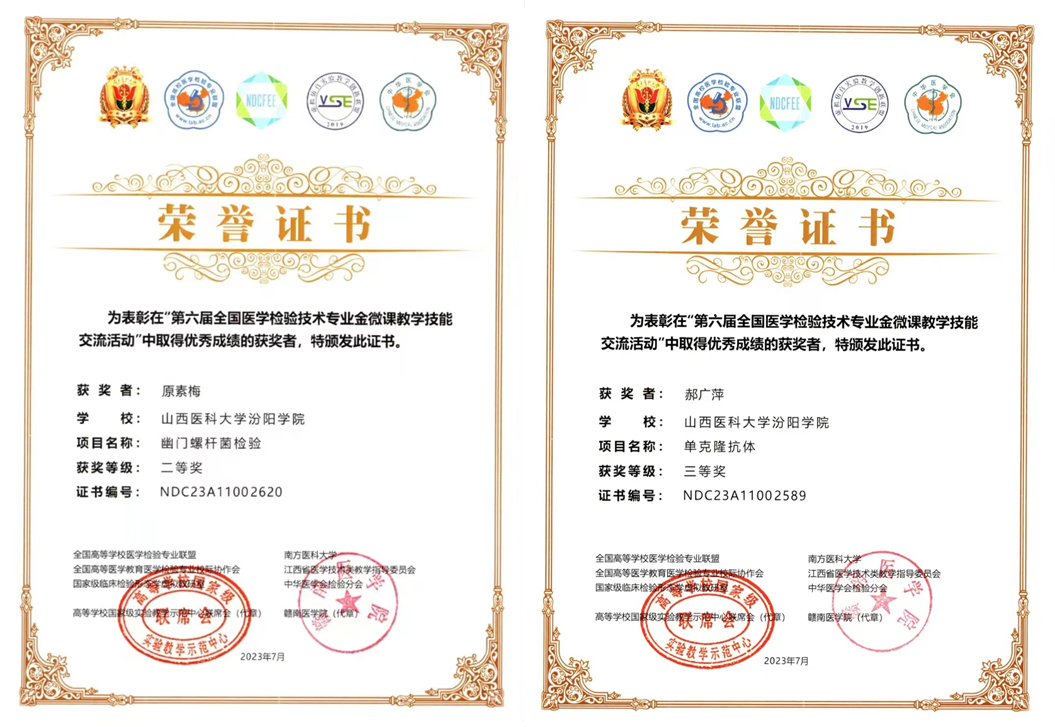 7月14日至7月17日,由高等学校国家级实验教学示范中心联席会、全国高等医学教育医学检验专业校际协作会、全国高等学校医学检验技术专业联盟等单位主办,中华医学会检验分会协办的2023年全国医学检验信息化发展论坛暨信息化成果展示交流会在江西赣州举行。世界杯官网医学检验系原素梅老师、郝广萍老师分别在金微课比赛中获得二等奖、三等奖,薛翠娥老师、刘俊琴老师和张晓延老师指导的720班李晶玥同学和s722班左佳煜同学分别获得形态学大赛本科组三等奖,为世界杯官网争得了荣誉。