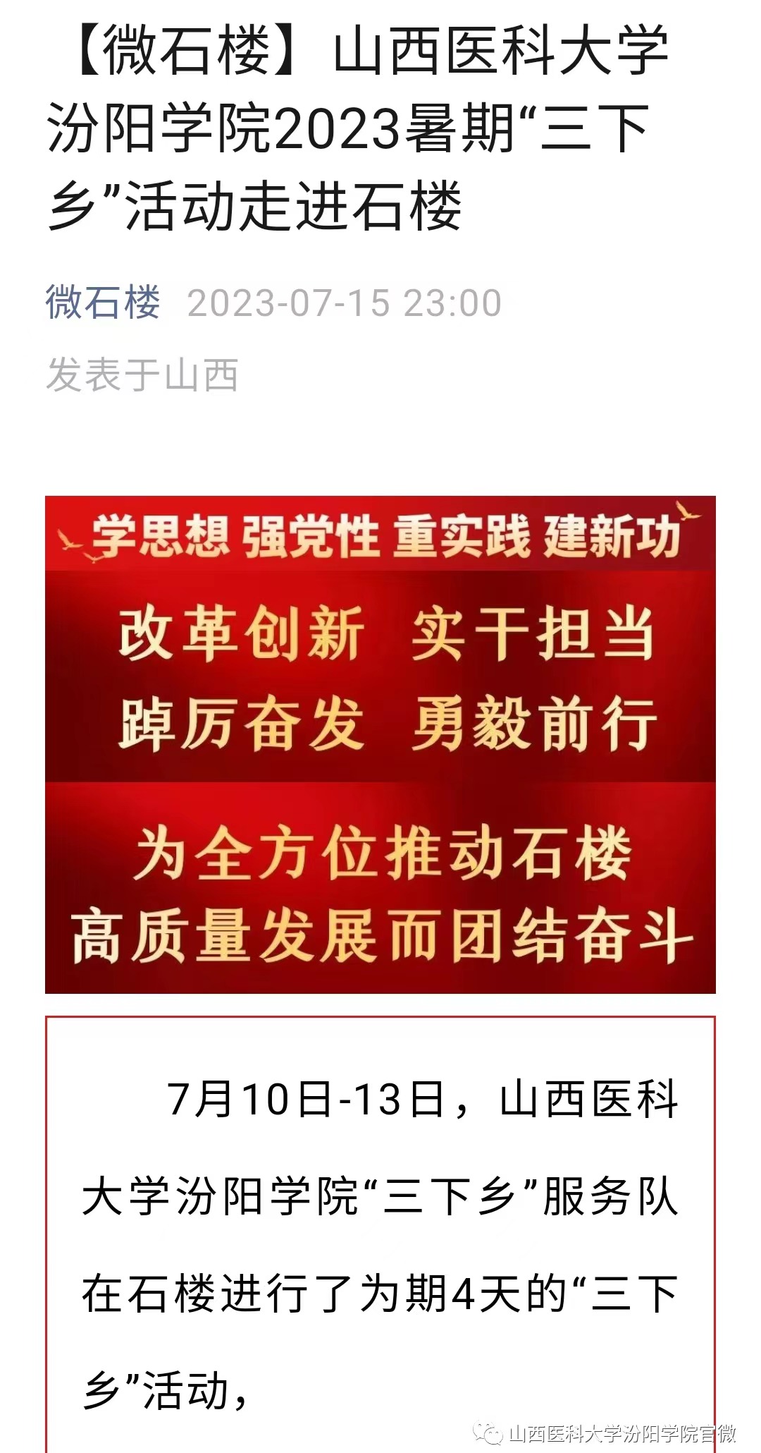 石楼县融媒体中心的微信公众号“微石楼”对世界杯官网师生的暑期“三下乡”实践活动进行了报道。