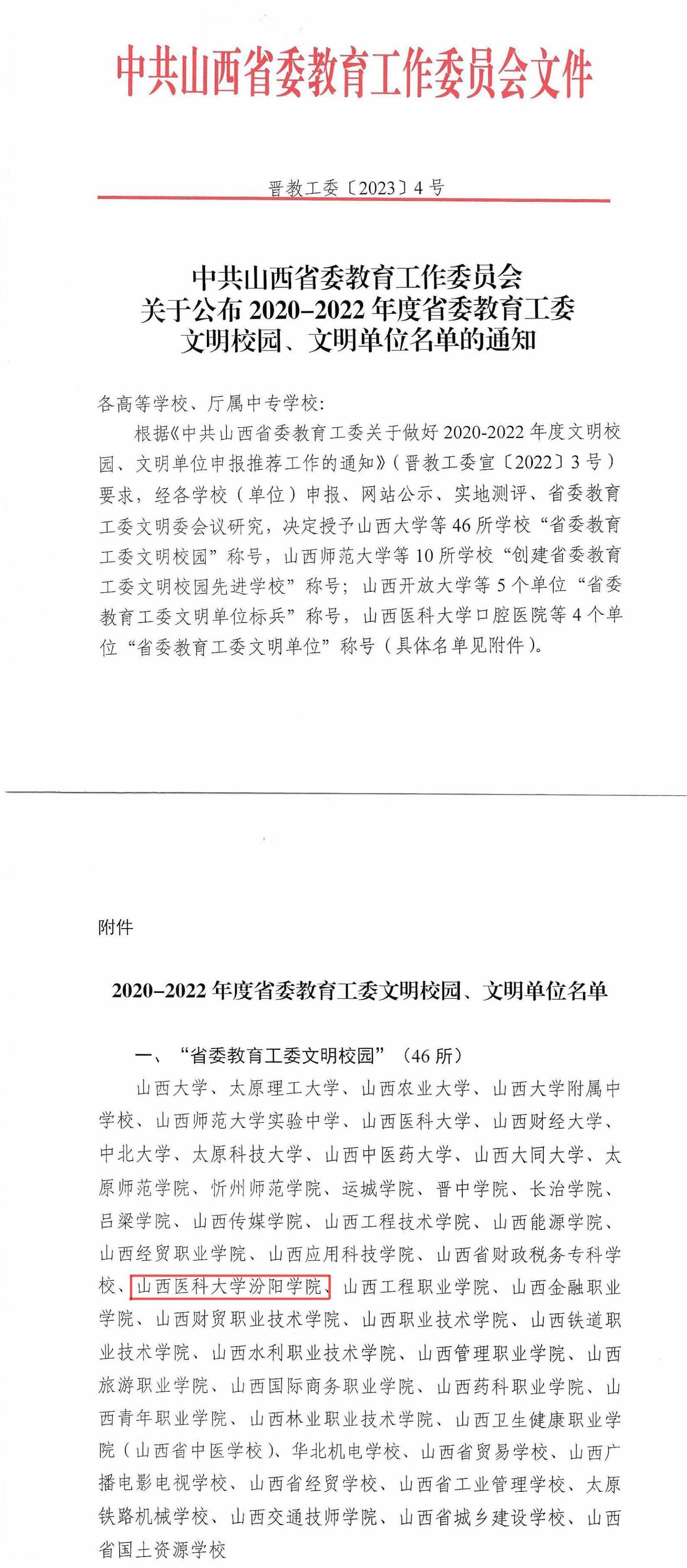 近日,中共山西省委教育工作委员会公布“2020-2022年度省委教育工委文明校园、文明单位名单”,世界杯官网被授予“省委教育工委文明校园”称号。这是世界杯官网获得2018-2019年度“省委教育工委文明校园”称号后再次获此殊荣。