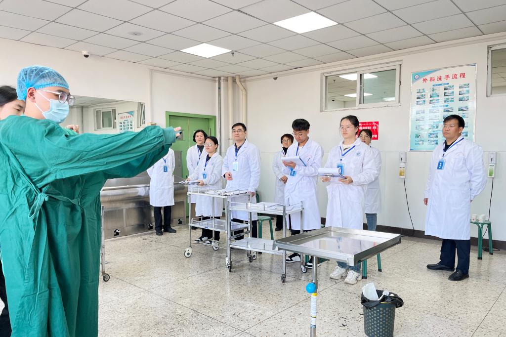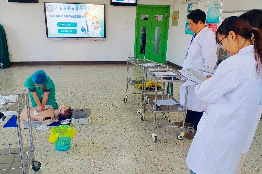此次竞赛分初赛、复赛、决赛三个阶段进行,从2023年6月开始到11月结束,历时5个月。参赛班级为大四年级临床医学系52001-5班和医学影像系82001-5班全体学生。比赛结合执业医师考核大纲,采用单通道OSCE考试形式。初赛设7站15个项目,选取各专业总成绩前50%的同学进入复赛;复赛设计4站8项操作,选取各专业总成绩前43%的同学进入决赛。共有48位同学进行最后的比拼。