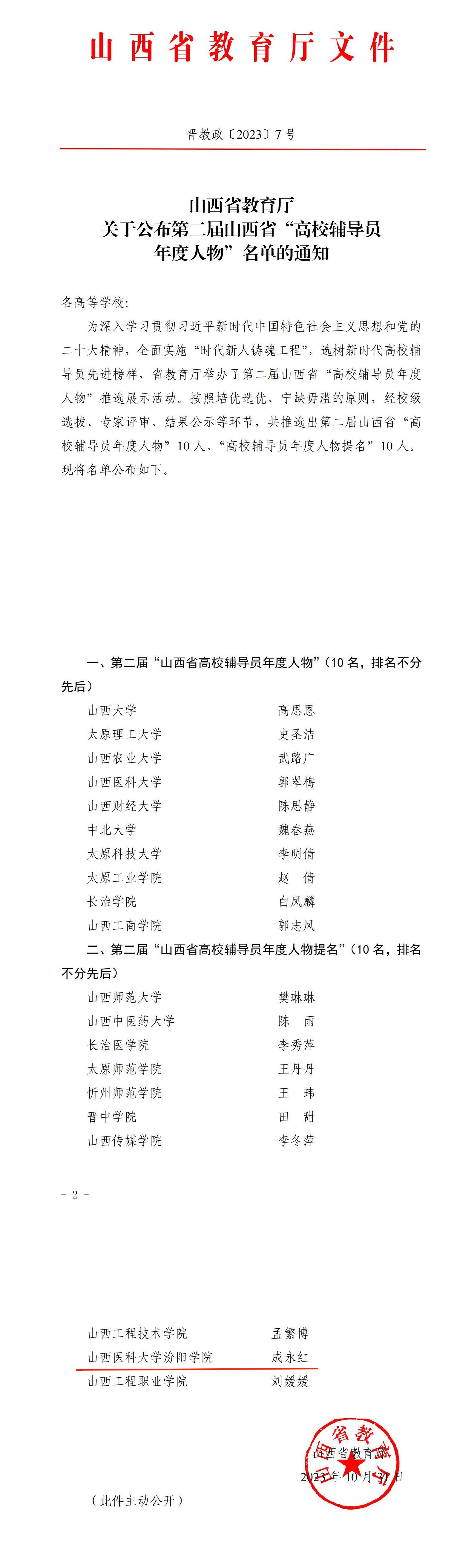 近日,省教育厅公布第二届山西省“高校辅导员年度人物”名单,经校级选拔、专家评审、结果公示等环节,共推选出第二届山西省“高校辅导员年度人物”10人、“高校辅导员年度人物提名”10人。世界杯官网辅导员成永红老师荣获第二届山西省“高校辅导员年度人物提名”。