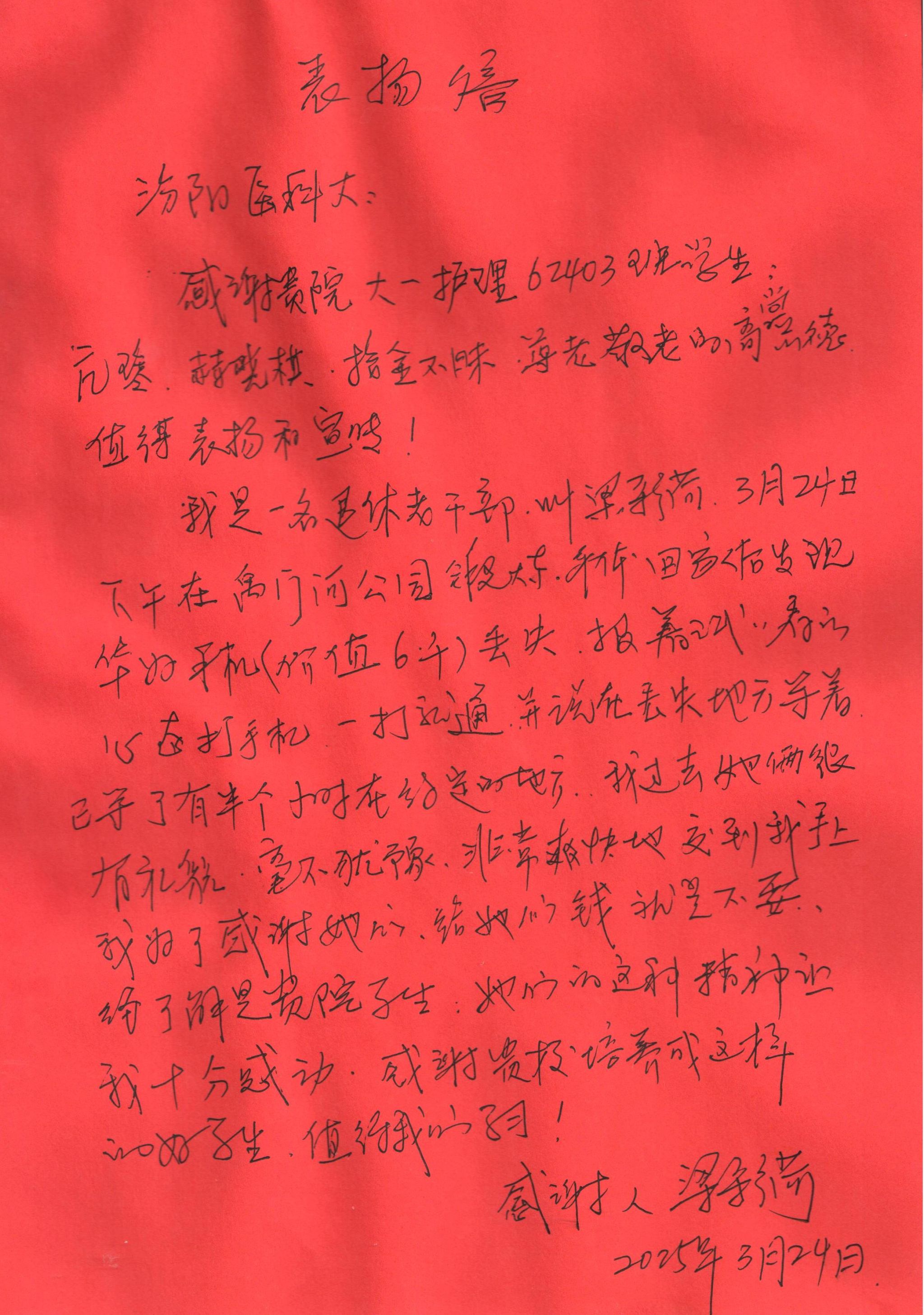 2025年3月24日,世界杯官网护理学系62401-10班的两名学生在禹门河公园捡到了一部价值六千元的手机。面对这笔财物,两位同学心照不宣地共同等待失主。半个小时后,失主向丢失的手机打来电话,双方取得联系。失主赶来后拿出感谢金感谢她们,她们拒绝了。不久后,失主向学校写来了感谢信表扬两位同学的拾金不昧精神。