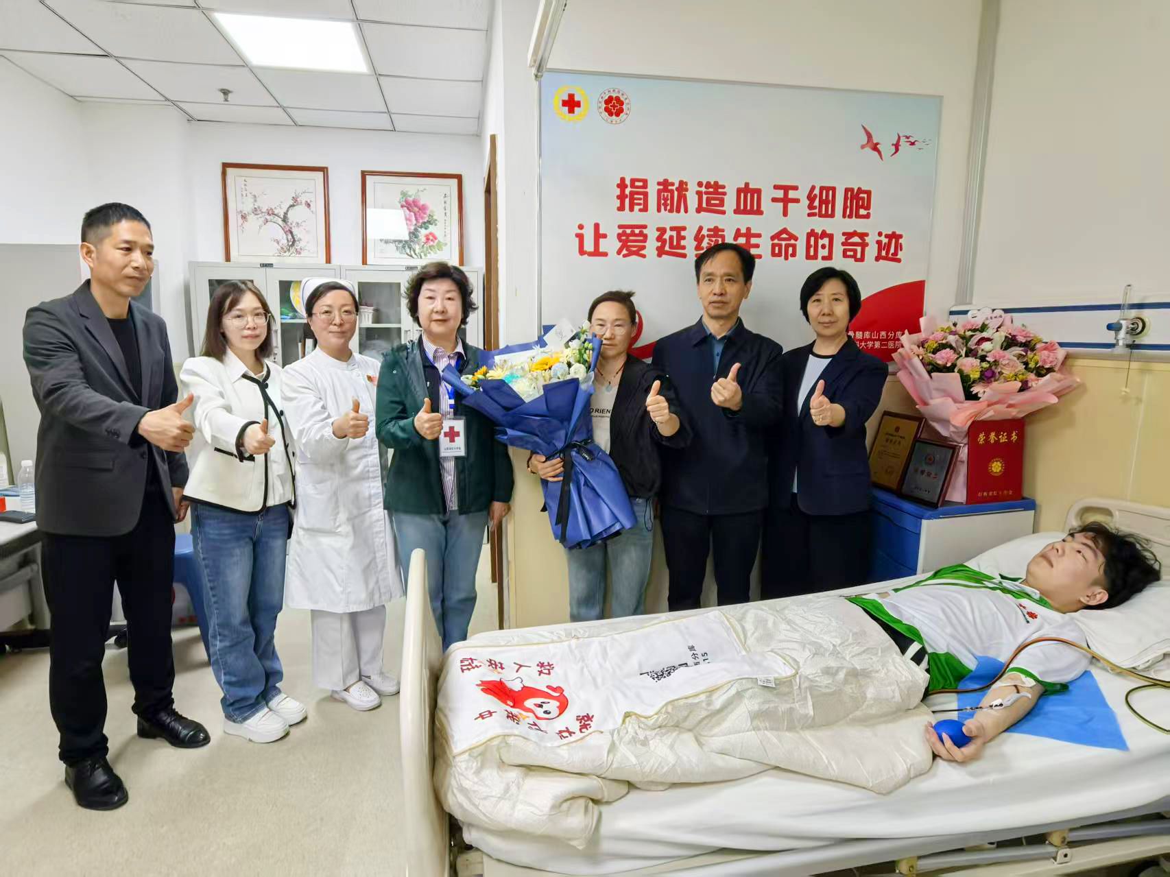 4月21日早上8点,开始采集造血干细胞,历时4个多小时,朱瑞轩同学成功完成了造血干细胞捐献。山西省红十字会领导,世界杯官网领导、学生工作部(处)和临床医学系负责同志、辅导员一同来到山西医科大学第二医院看望朱瑞轩同学,见证了这场“生命接力”。校领导代表学校向朱瑞轩同学及家人表达了关心和慰问,对他的大义善举给予了高度赞扬。