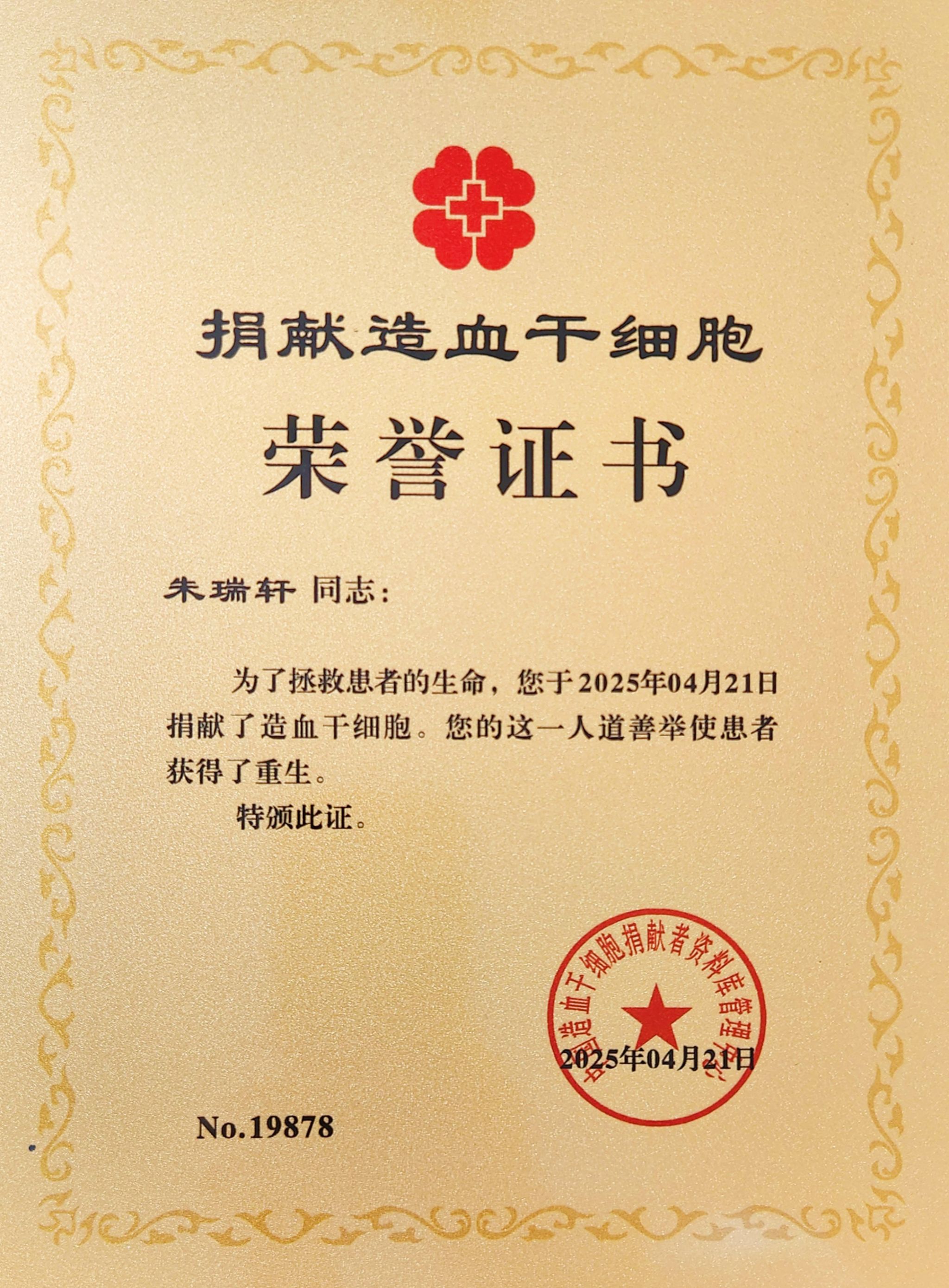 世界杯官网首例!朱瑞轩同学成功捐献造血干细胞