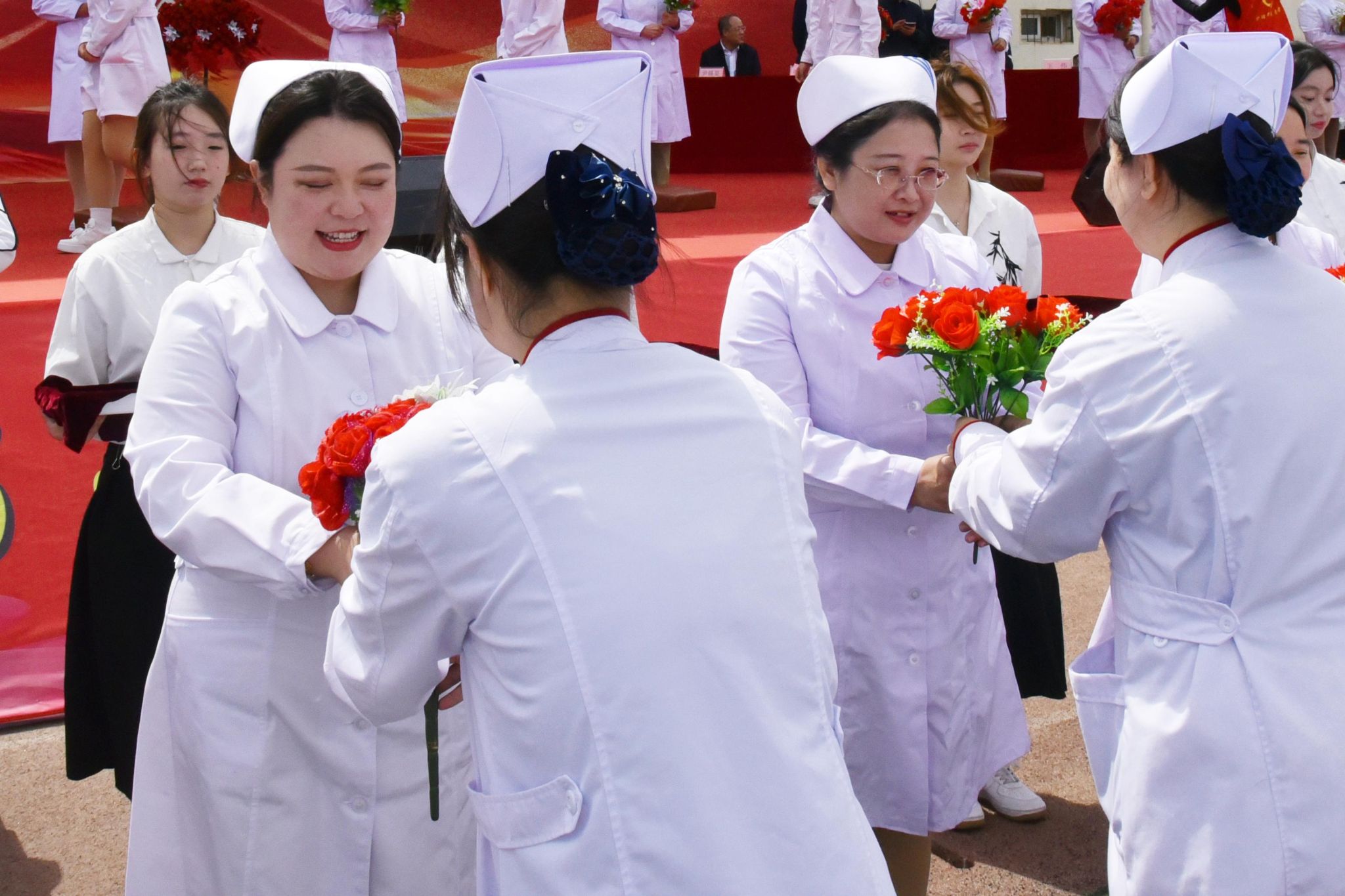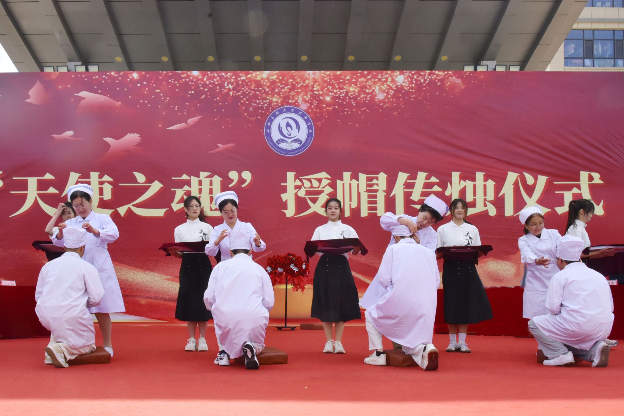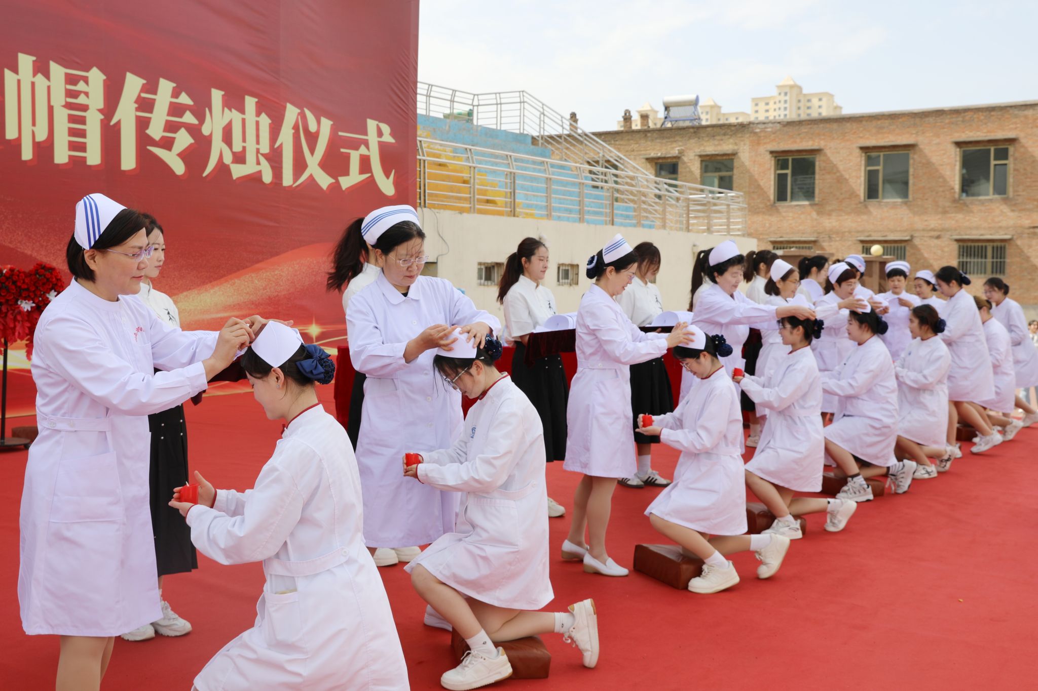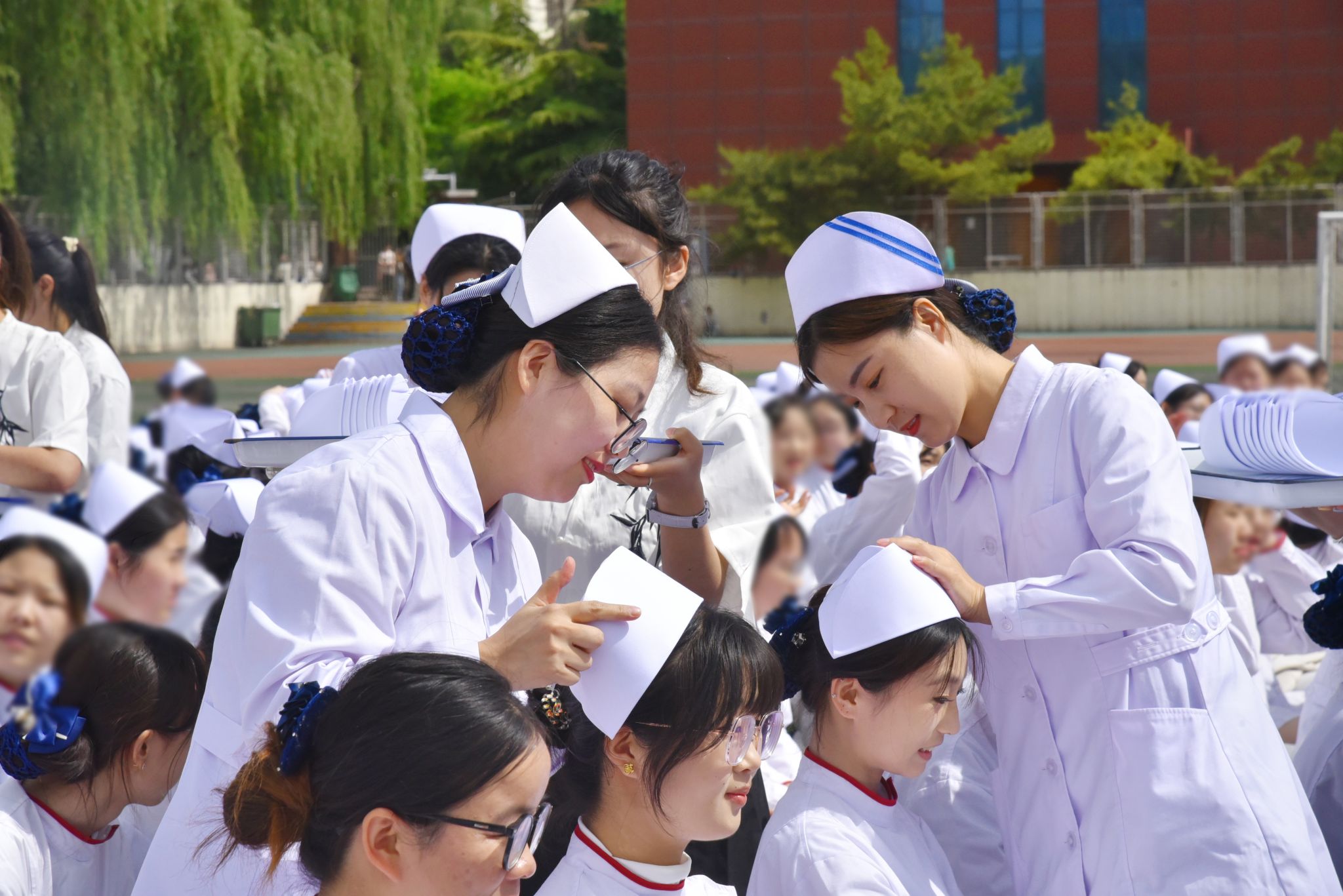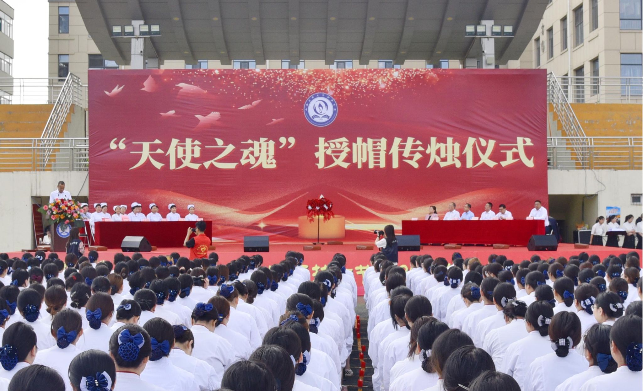 护理前辈和老师们为新入职教师和即将走向实习岗位的2022级1118名护生授帽。