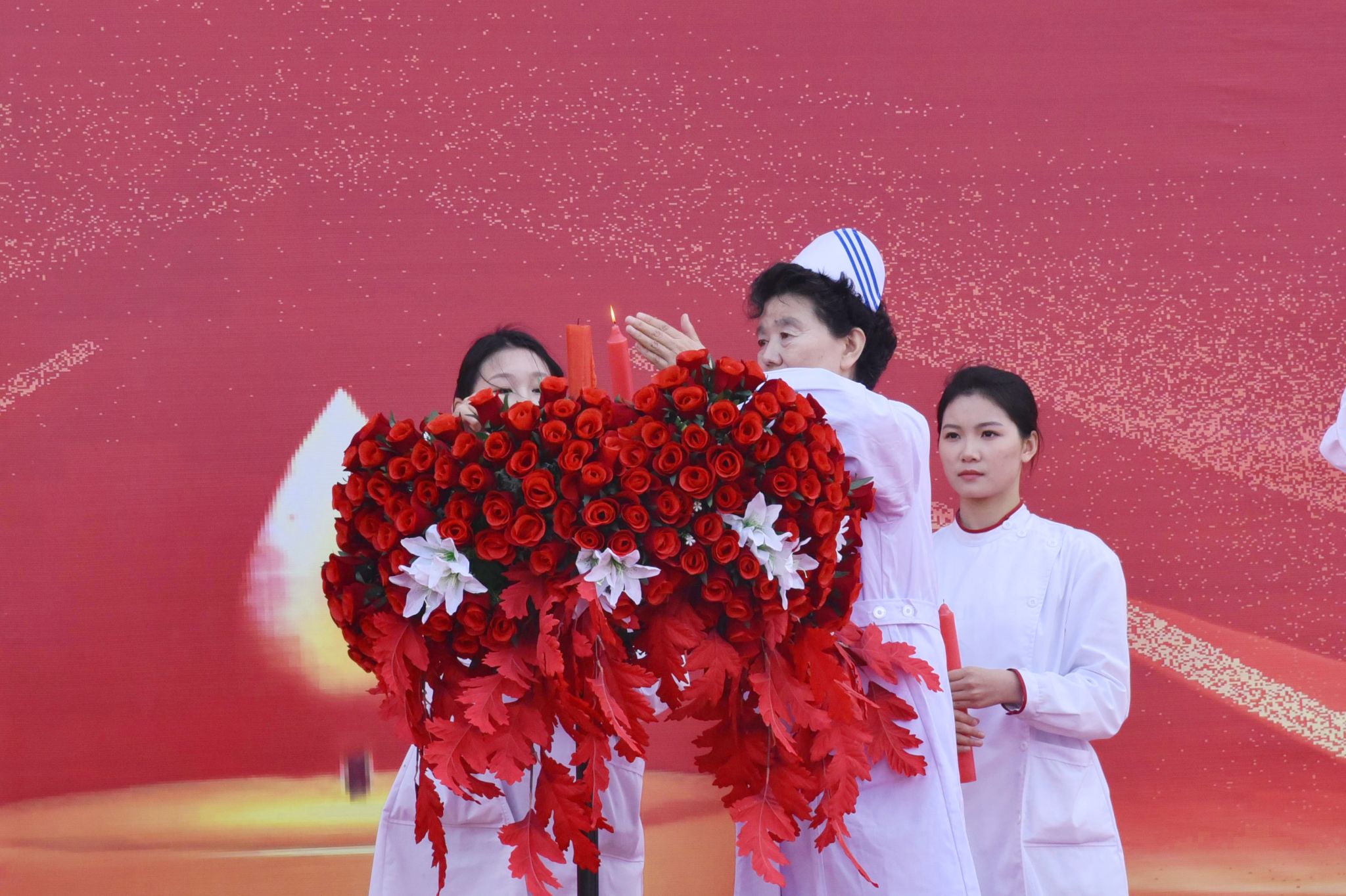 护理前辈崔芙蓉教授点燃象征护理精神的烛火,护生依次传递。