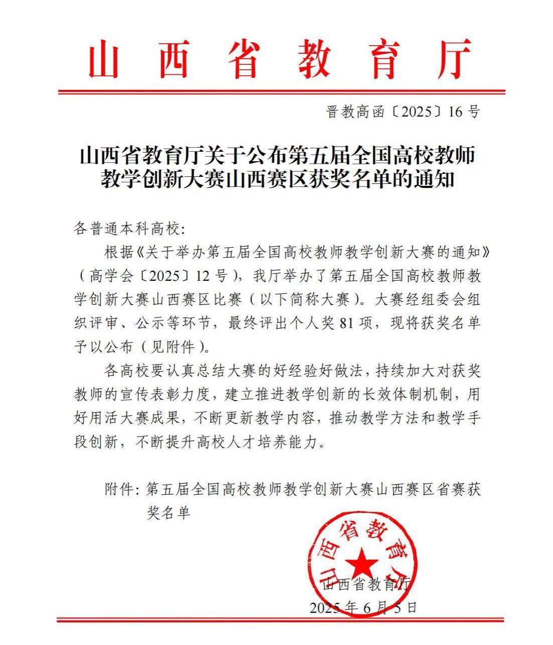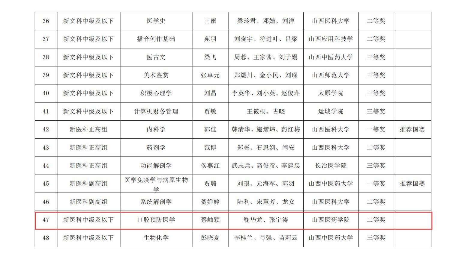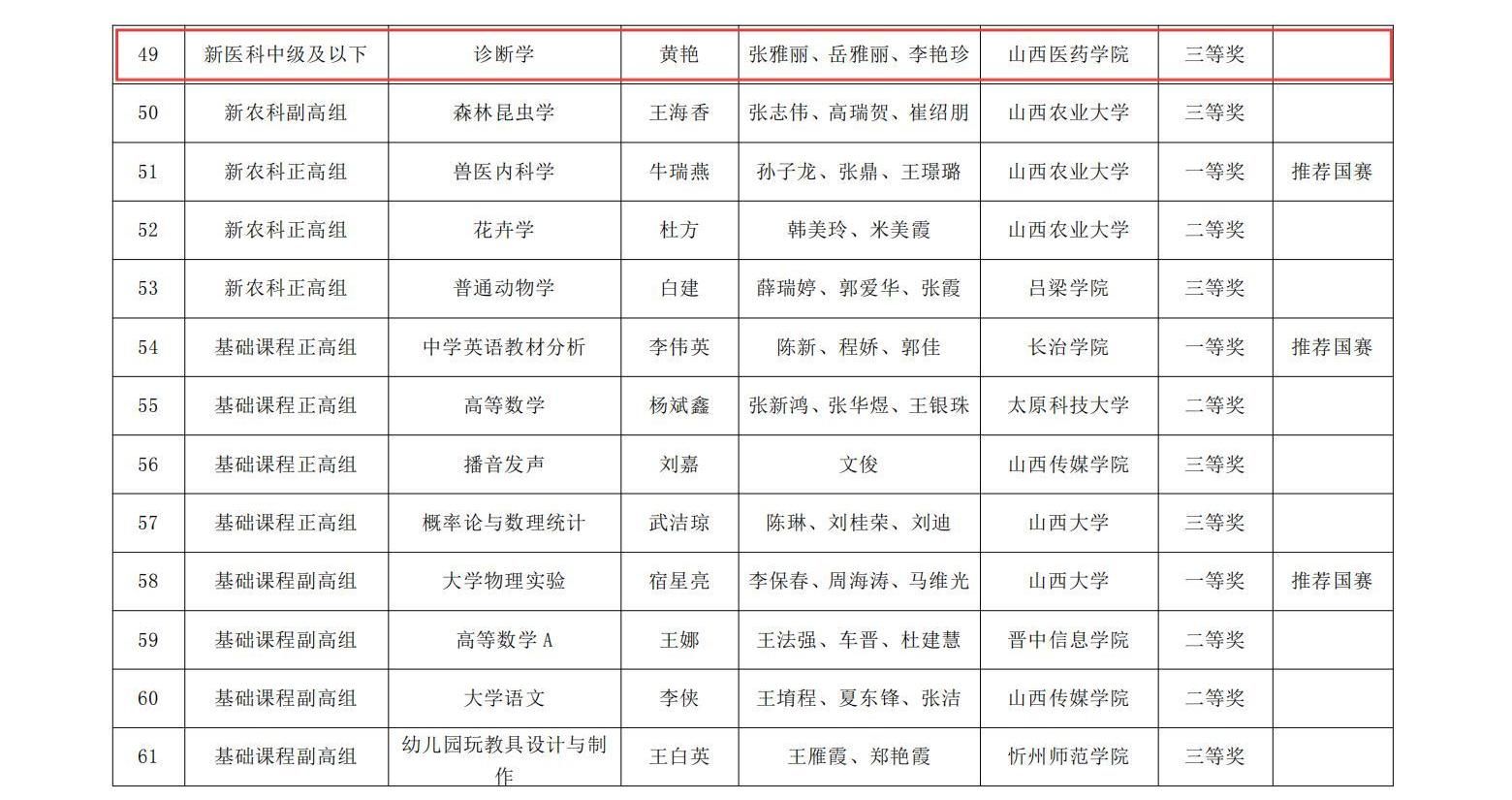 近日,山西省教育厅发布了《山西省教育厅关于公布第五届全国高校教师教学创新大赛山西赛区获奖名单的通知》(晋教高函〔2025〕16号),世界杯官网三个教师团队在此次比赛中喜获佳绩。其中,蔡岫颖教师团队荣获新医科中级及以下组二等奖、黄艳教师团队荣获新医科中级及以下组三等奖、宋维芳教师团队荣获产教融合组三等奖。