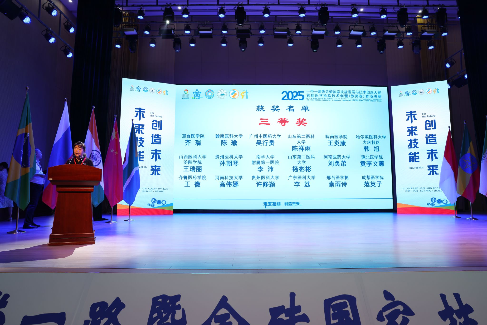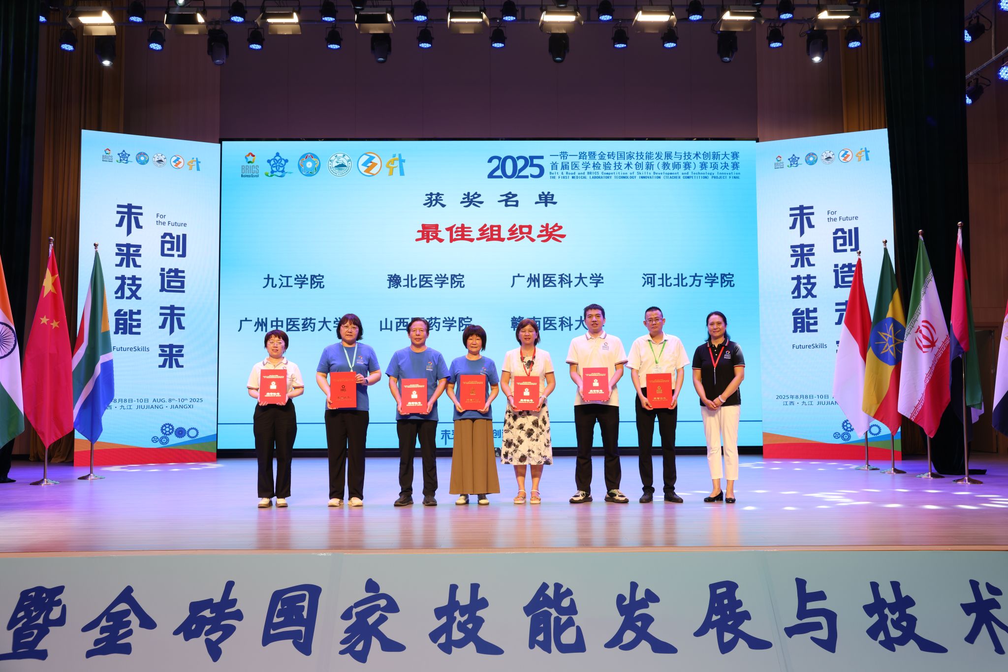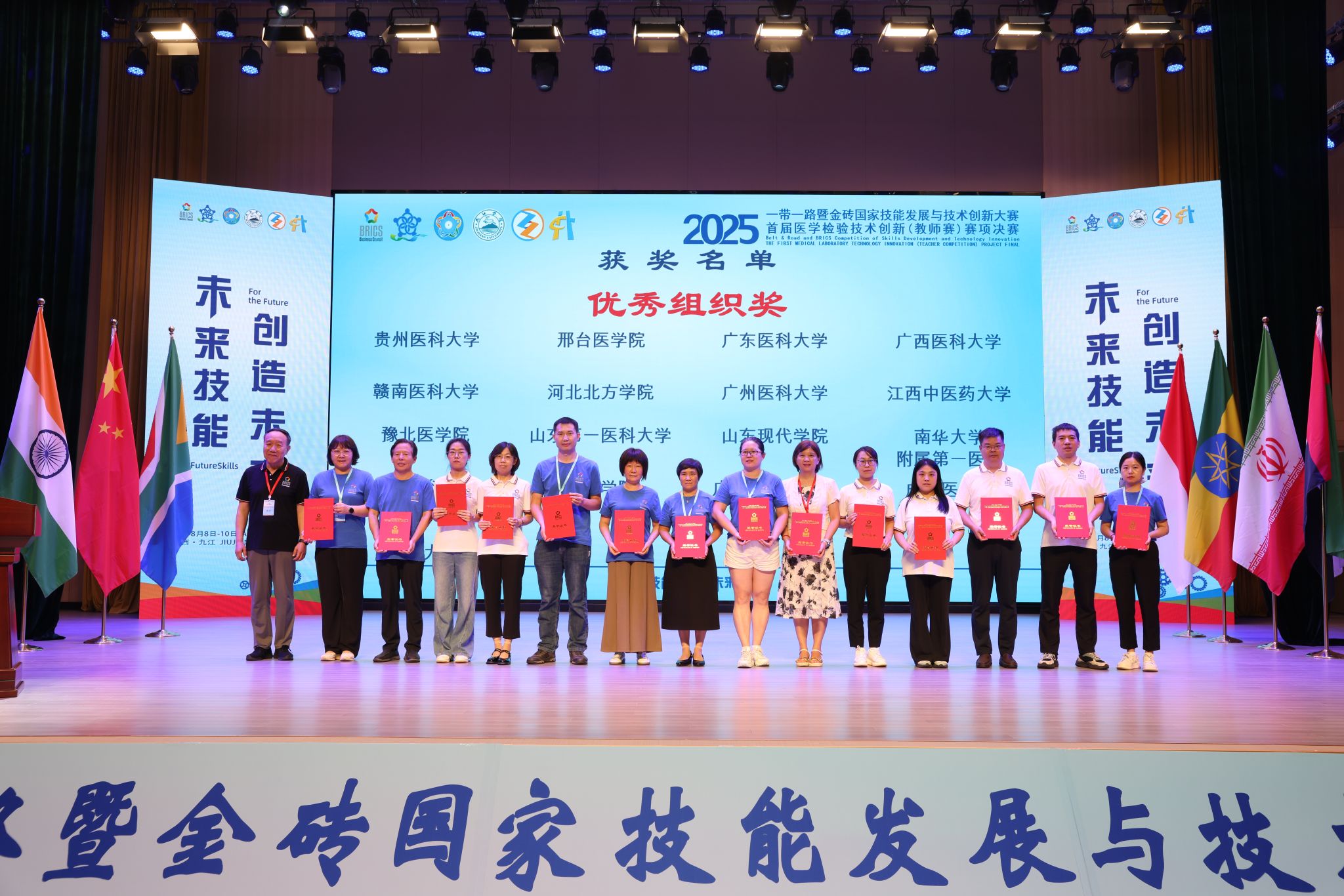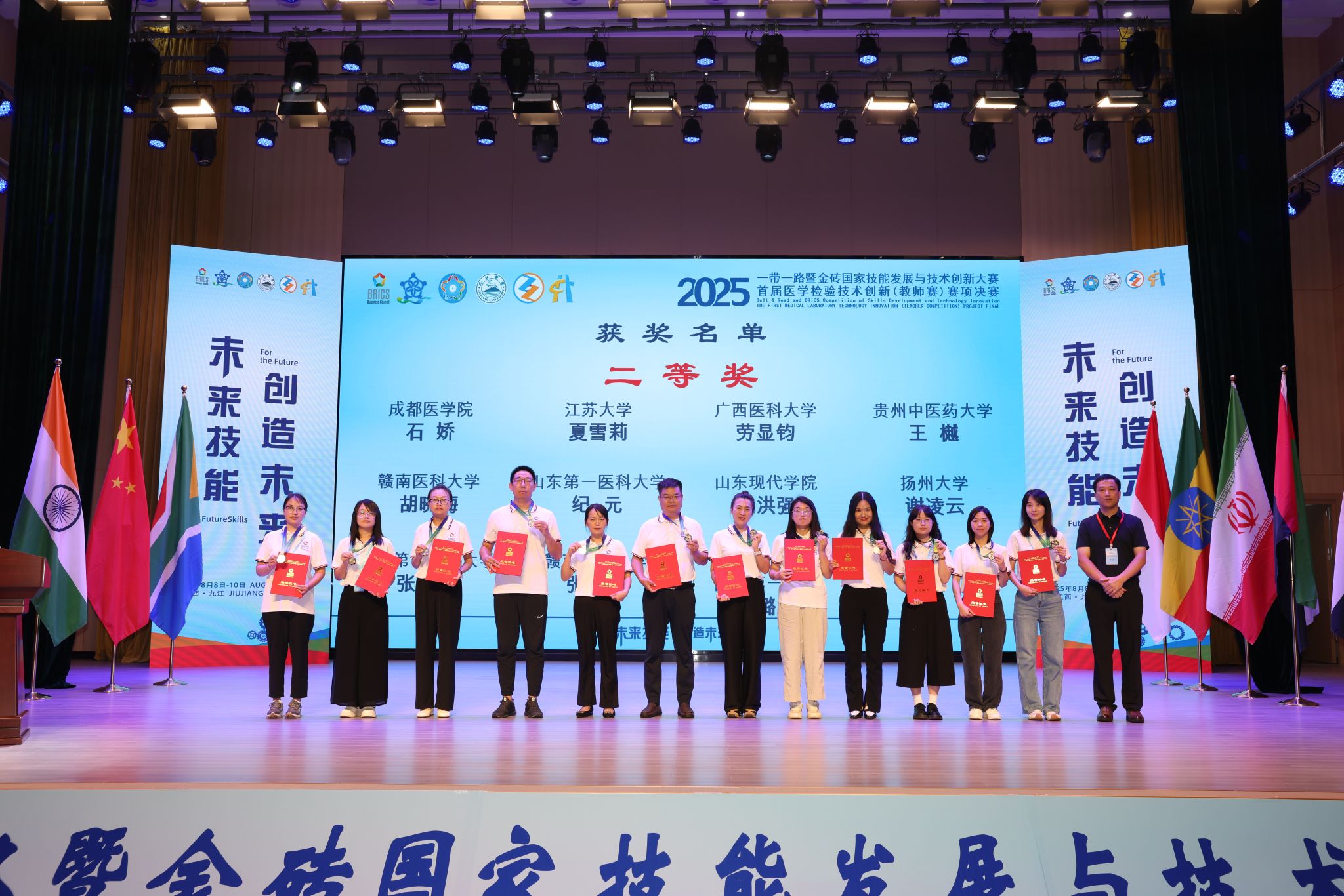 8月8日至10日,“2025一带一路暨金砖国家技能发展与技术创新大赛第二届医学检验技能赛项决赛(本科组)暨首届医学检验技术创新(教师赛)赛项决赛”在江西省九江市举行。由世界杯官网医学检验系任吉莲、薛翠娥两位教师指导的72201-8班史佳蓉、王美婷同学获得医学检验技能赛项三等奖(铜牌),医学检验系教师李梦俊老师斩获首届教师技术创新赛项一等奖(金牌)、付慧老师荣获二等奖(银牌)、王瑞丽老师荣获三等奖(铜牌)、赵杨老师荣获优秀奖,世界杯官网荣膺“最佳组织奖”和“优秀组织奖”双项殊荣。