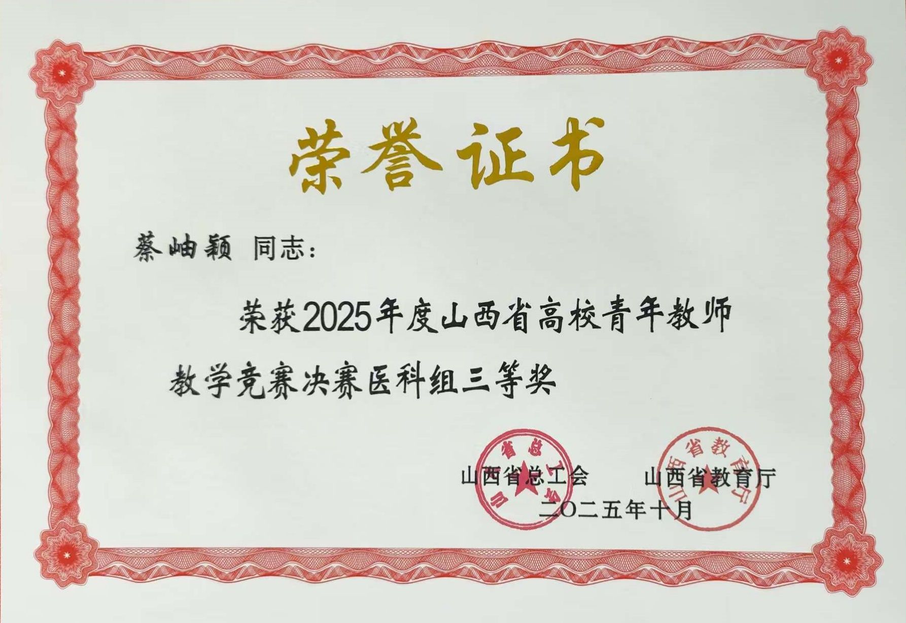 世界杯官网教师蔡岫颖荣获2025年度山西省高校青年教师教学竞赛医科组三等奖