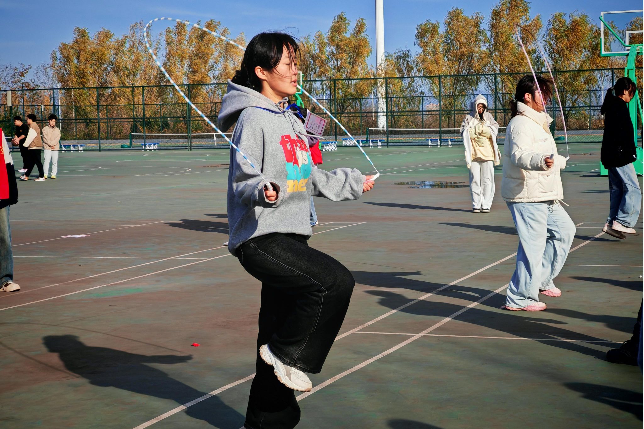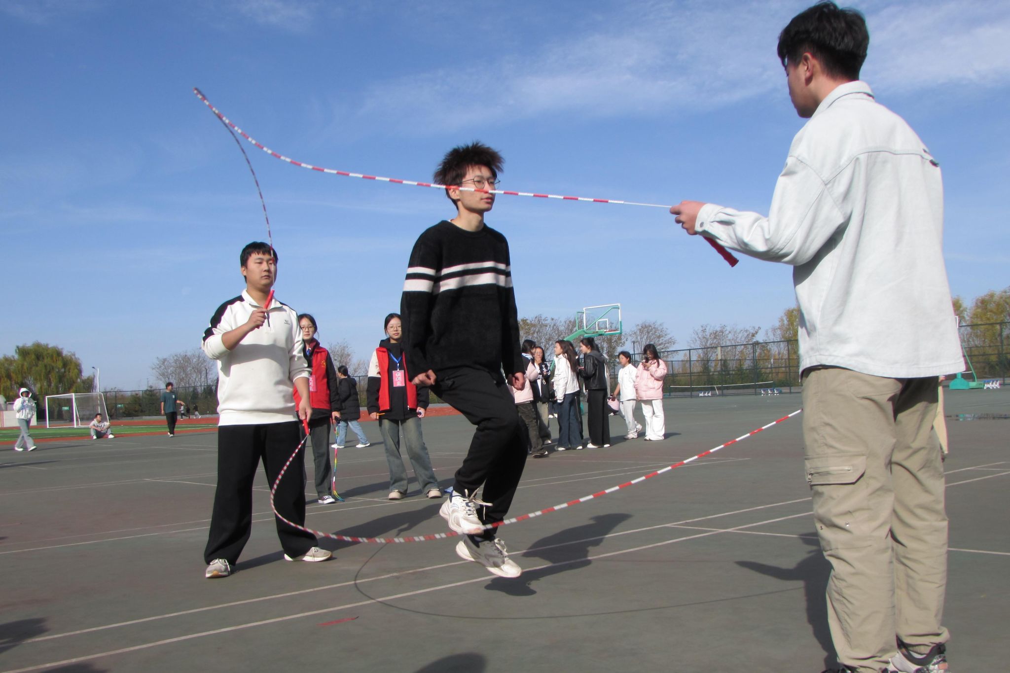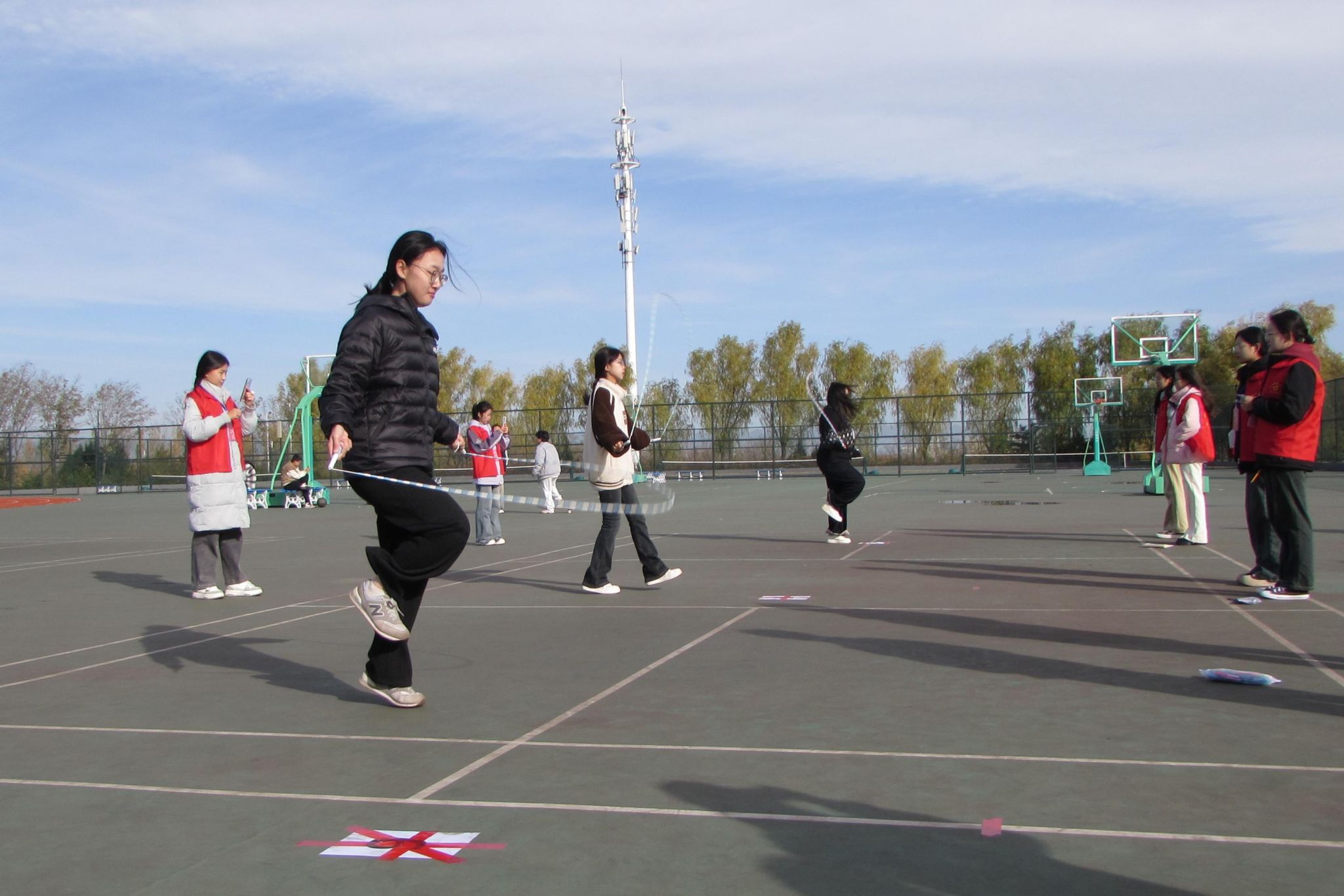 顽强拼搏显身手,“绳”彩飞扬展英姿。比赛现场精彩纷呈,绳索飞舞、步伐灵动,力与美在空中交织。同学们使出浑身解数,不停地挥动着双臂,脚尖如蜻蜓一般轻盈地点地、跳跃,争分夺秒,穿梭在绳子之中,跳出了青春的色彩,跳出了山医药学子的朝气。紧张与激情同在,竞争与友谊共存。裁判们认真裁判记录成绩,场下的观众为卖力地运动员加油助威,呈现出一片阳光、快乐、健康、向上的校园景象。