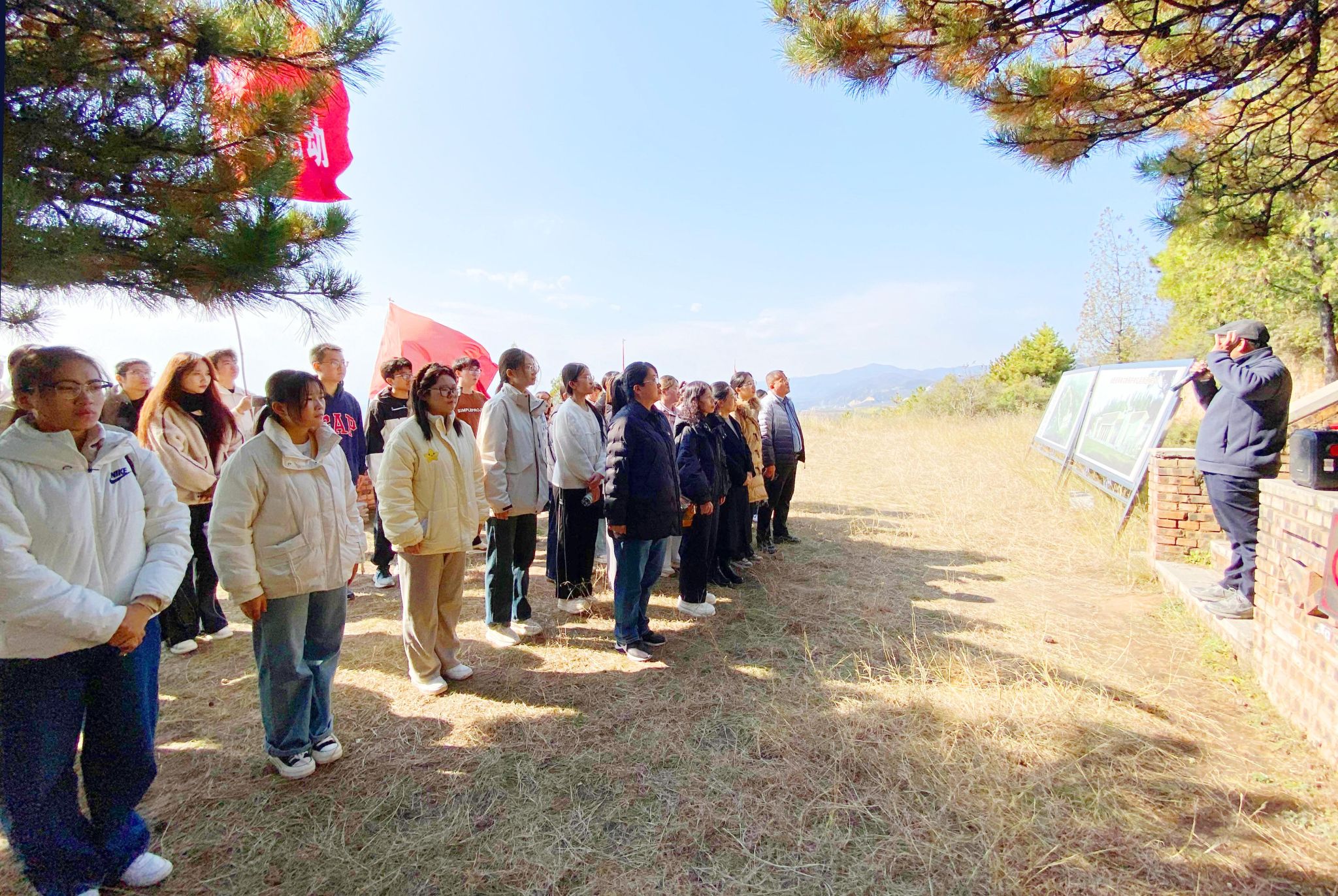 在庄严肃穆的敖坡烈士陵园,师生们整齐列队,怀着无比崇敬的心情,向革命先烈敬献鲜花,默哀致敬。同学们通过聆听老党员现场讲述曹启洪等十四位烈士血战敖坡的英雄事迹,深切感受到革命岁月的艰辛与伟大,深刻领悟了红色江山来之不易。这堂设在烈士长眠之地的特殊思政课,以强烈的现场感和仪式感,直击心灵,激励广大青年学子铭记历史、缅怀先烈,自觉传承红色基因,赓续共产党人的精神血脉,引导广大学生坚定马克思主义信仰、中国特色社会主义信念、中华民族伟大复兴信心。