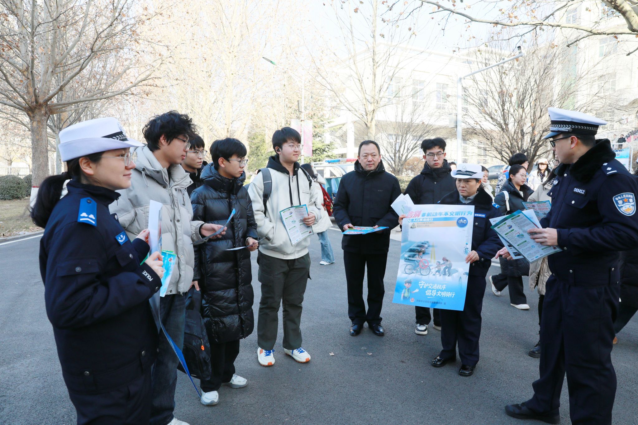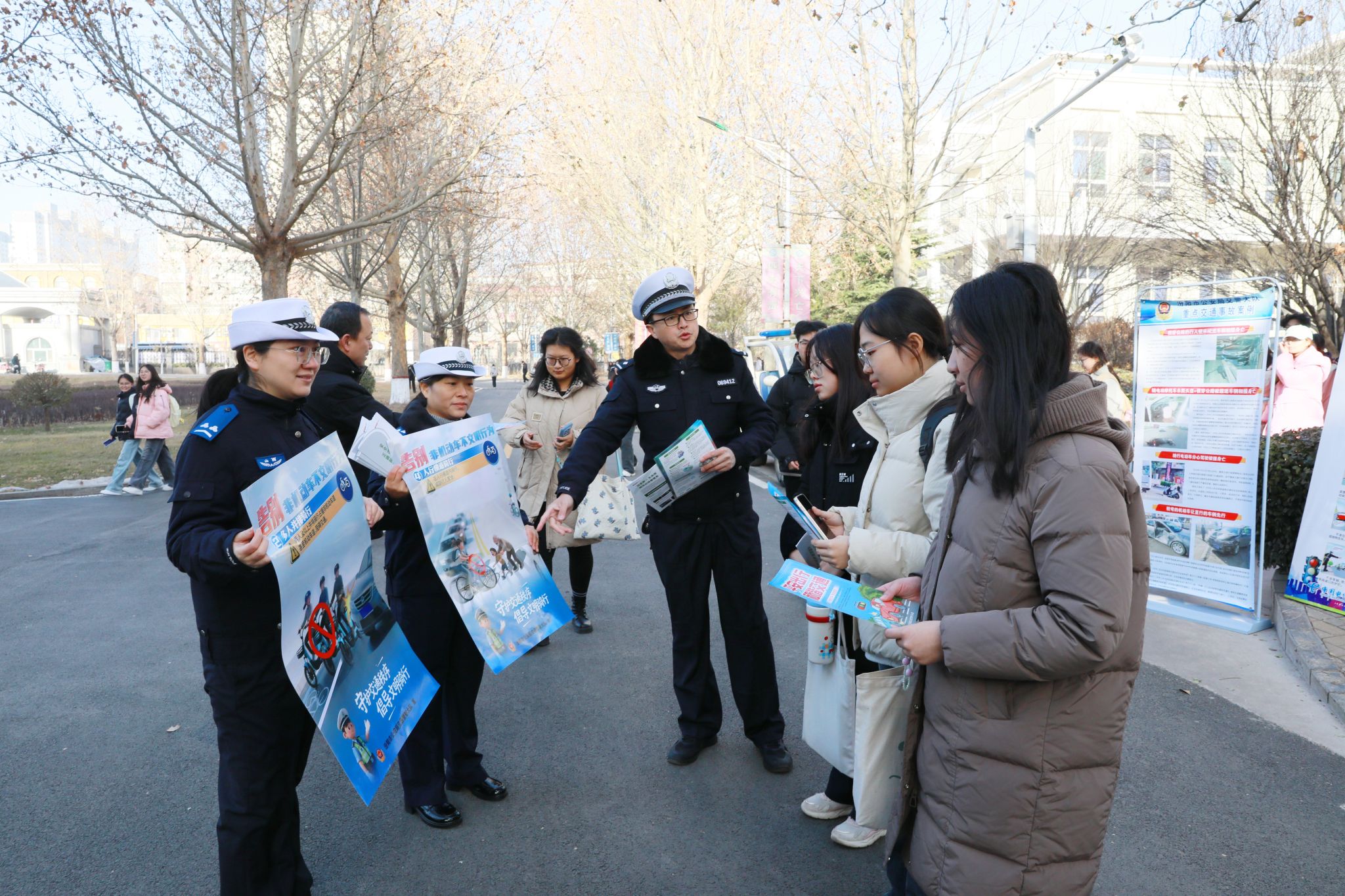 汾阳市公安局交通管理大队宣教科科长冯冠豪及民警走进校园,结合大学生群体出行频率高、新手驾驶员比例大、安全意识有待加强等特点,通过设立咨询台、发放交通安全宣传折页、张贴主题海报、开展真实案例宣讲等方式,全方位、多形式、立体化普及交通安全法律法规与出行常识,提醒同学们驾乘电动车要佩戴头盔,切勿无证驾驶、酒后驾驶、走路时看手机,通过正规渠道考取驾驶资格,引导学生树立法律意识、规则意识和安全意识。