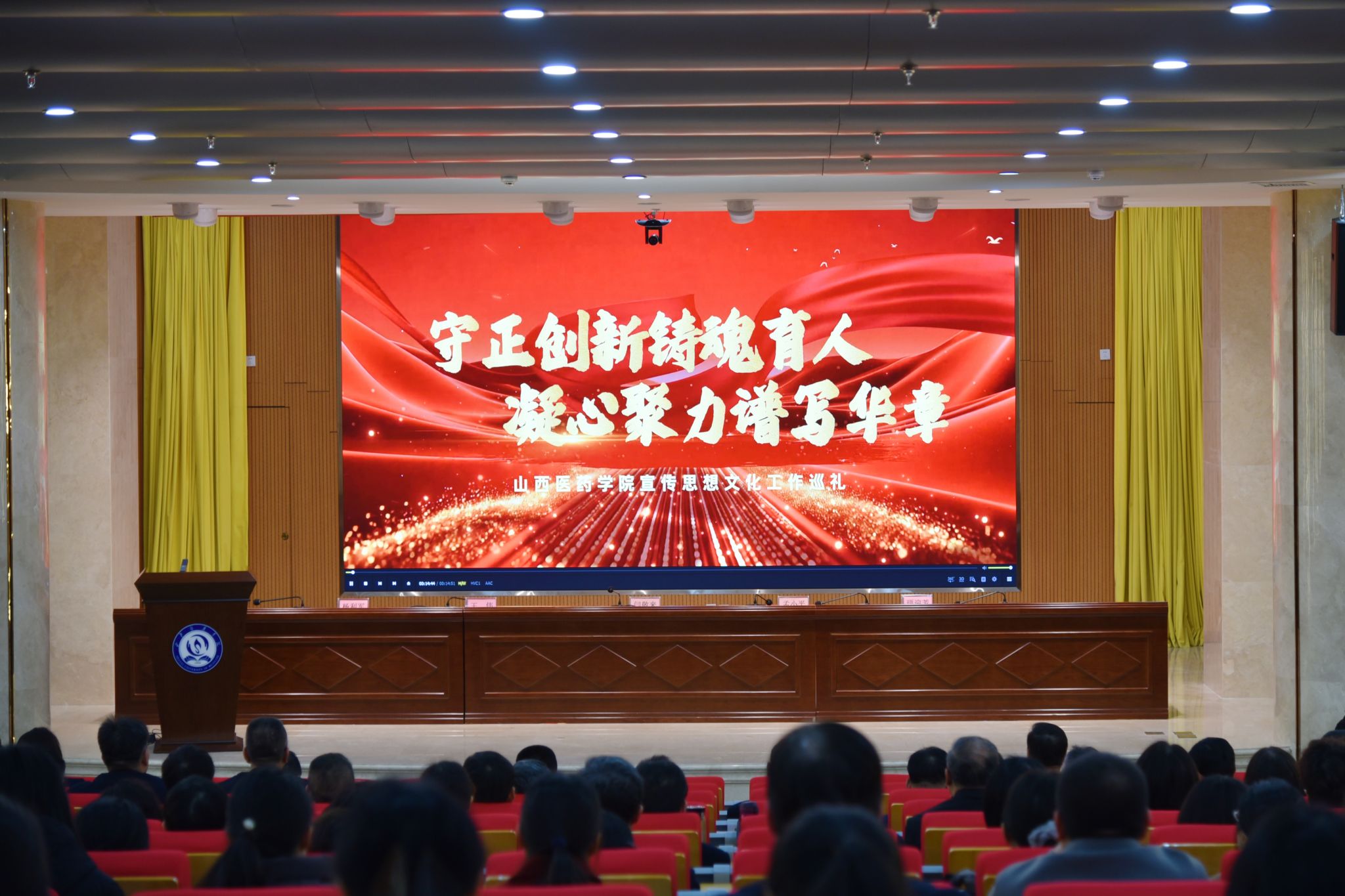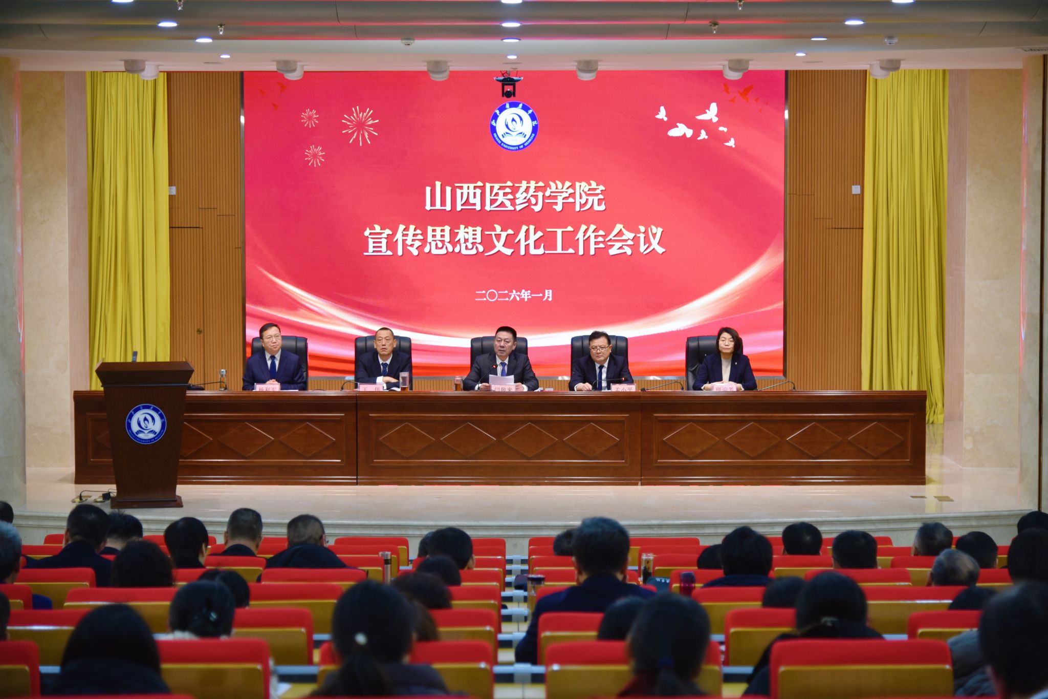 党委书记闫敬来以《构筑精神家园 凝聚奋进力量》为题作讲话。他充分肯定了党的二十大以来学校宣传思想文化工作围绕中心、服务大局、凝聚人心、鼓舞干劲所取得的显著成绩,并就继续做好今后工作提出三点要求。一是宣传工作的镜头要对准广大师生员工。理论宣讲要贴近师生实际,新闻宣传要挖掘生动鲜活的基层故事,让师生成为宣传的真正主角。要善讲“家常话”,要会记录“奋斗日常”,要多传播“身边暖意”,全面提升宣传工作的感染力、亲和力和实效性。二是思政工作要贴近人心,解忧暖心。要主动深入一线,“走进师生”察实情、听真话;要着力“解难助困”,要拓宽“沟通渠道”,营造“长辈关怀、同辈互助”的良好氛围,让每个人在需要时都能获得支持与指引。三是文化建设工作要聚焦以文化人、以文育人。要让环境彰显“医学底色”,持续完善校园文化景观建设,广泛普及文化标识系统、制作推广文创产品,用好图书馆、校史馆、人体生命馆的育人功能,着力打造书香校园、文化校园、文明校园;要让校史积淀“家园记忆”,深化校史校情教育,精心设计典礼仪式等文化活动,邀请优秀校友代表回校讲述奋斗往事,增强师生的认同感与归属感;要让活动增进“家园情谊”,组织丰富多彩的师生文体活动,优化服务设施,于细微处传递关怀,营造温暖、融合、有凝聚力的文化氛围。
