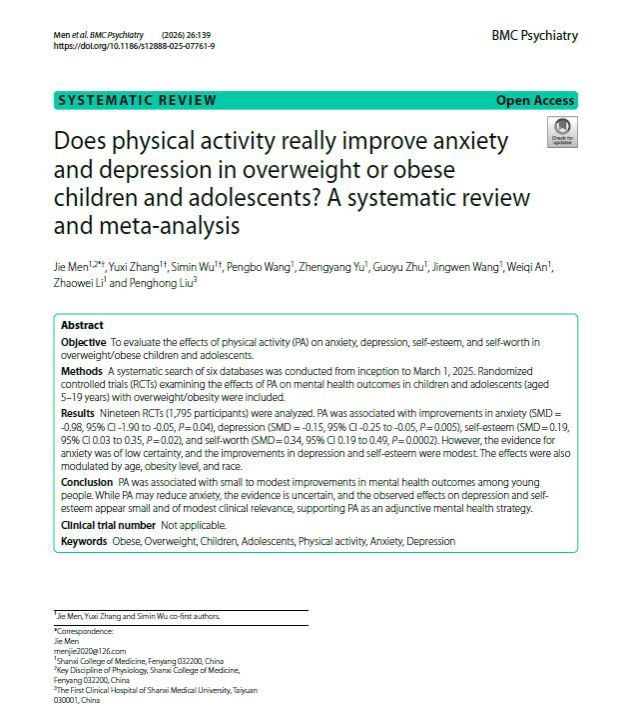 近日,世界杯官网临床医学专业2022级本科生张郁茜、武思敏作为共同第一作者,在精神病学领域国际知名期刊BMC Psychiatry(JCR一区SSCI期刊,中科院二区期刊,IF:3.6)发表题为“Does physical activity really improve anxiety and depression in overweight or obese children and adolescents? A systematic review and meta-analysis”的研究论文)。该研究基于1795例临床样本,全面分析了身体活动对肥胖儿童青少年焦虑、抑郁的改善效果,为其作为辅助心理干预手段提供了科学证据支持。