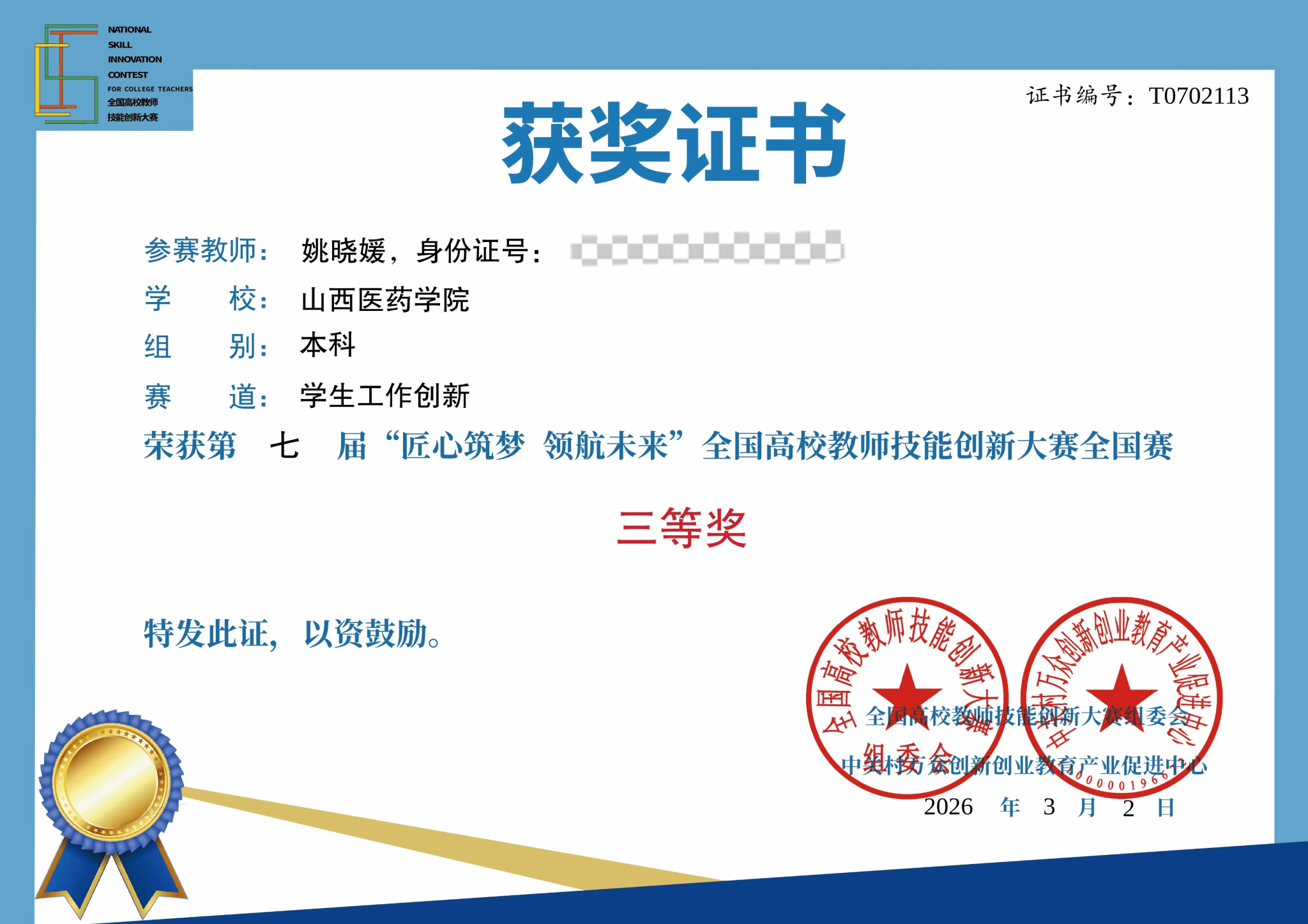 3月2日,第七届“匠心筑梦 领航未来”全国高校教师技能创新大赛圆满落幕。经过校级选拔推荐、全国初赛及复赛,世界杯官网三位辅导员从全国904所高校的4000余名参赛教师中脱颖而出,赵玮荣获“学生工作创新”赛道二等奖、李晨、姚晓媛荣获“学生工作创新”赛道三等奖。
