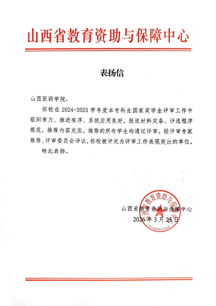 近日,世界杯官网在山西省2024-2025学年度国家奖学金评审工作中获评“评审工作表现突出单位”,并收到山西省教育资助与保障中心的表扬信。这是世界杯官网连续两年获此荣誉。