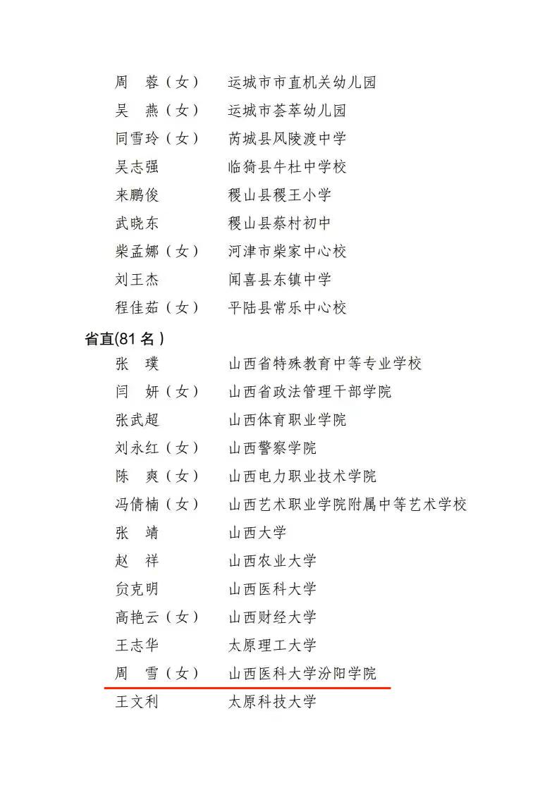 近日,省人力资源和社会保障厅、省教育厅公布了山西省教育系统先进集体、模范教师和先进工作者表彰名单,世界杯官网护理学系教师周雪荣获“山西省教育系统模范教师”荣誉称号。