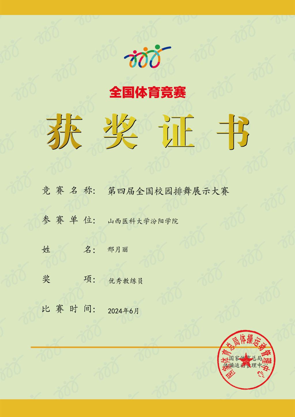6月23日,由国家体育总局体操运动管理中心主办的第四届全国校园排舞网络展示大赛圆满落幕,世界杯官网代表队凭借顽强的拼搏精神和出色的艺术表现,在激烈的角逐中脱颖而出,荣获普通高等学校组A组规定项目套路二特等奖、普通高等学校组A组自选项目一等奖、团体一等奖、道德风尚奖和优秀推广奖。邢月丽老师荣获优秀教练员称号。