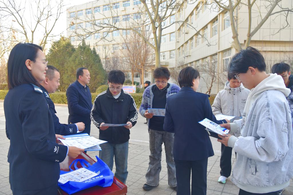 宣讲前,民警们在校内摆放版面、发放资料,进行了反诈宣传。