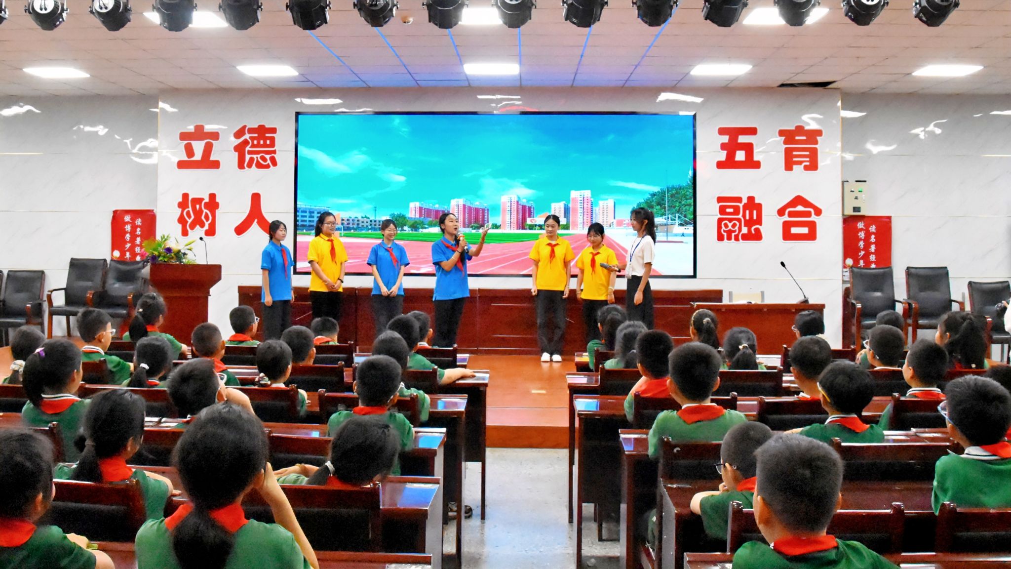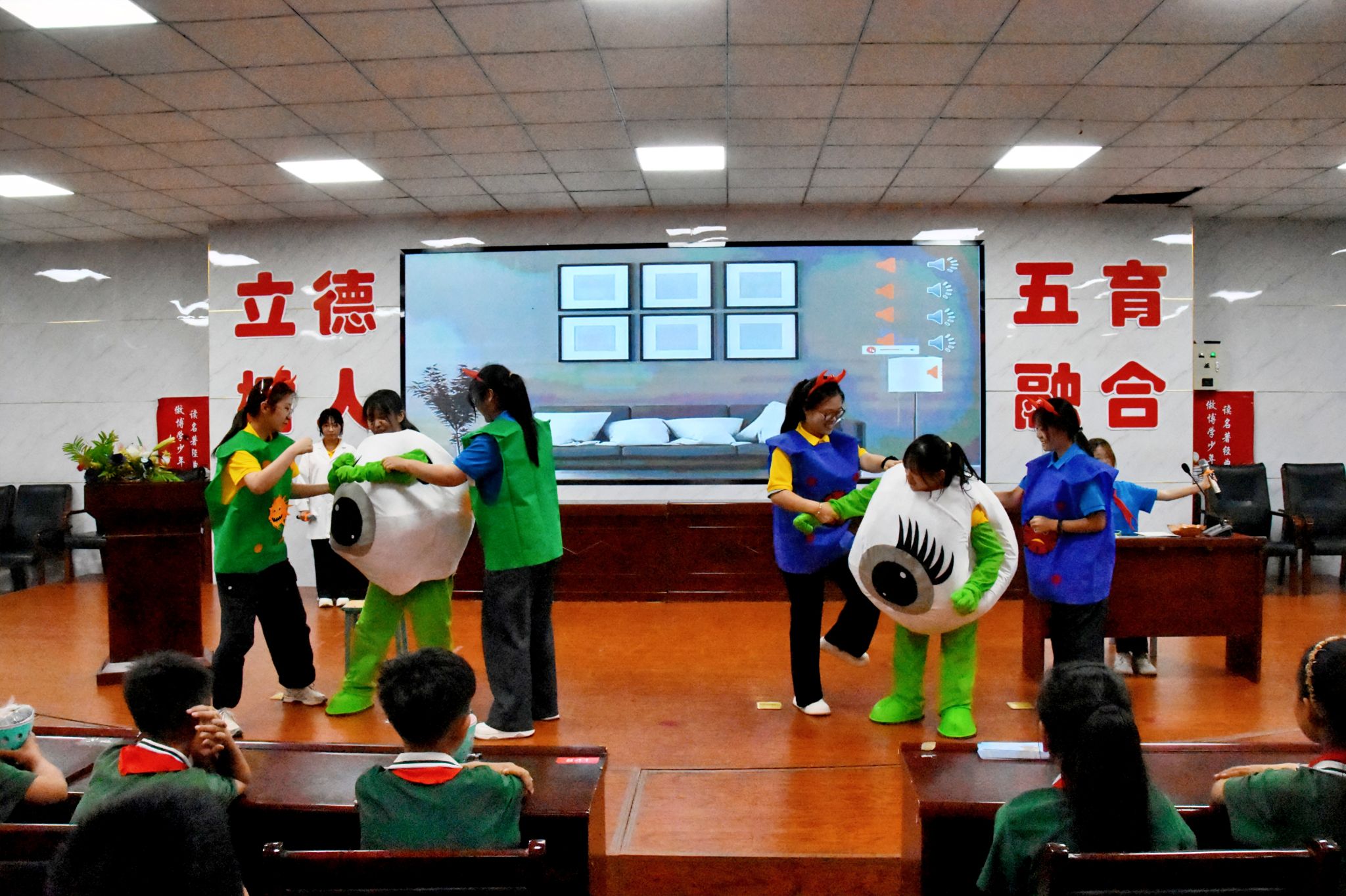 活动中,世界杯官网眼视光学系的同学们发挥专业所长,把爱眼护眼知识融入趣味情景剧《我的视力我做主》《神奇的用眼指南》中,将专业智慧转化为生动教育,让小朋友们直观感受到了视力健康的重要性;手势舞《光明的未来》,把抽象的爱眼理念转化为小朋友们可感可知的鲜活故事与律动节奏;在“爱眼护眼小妙招”环节中,大学生们化身亲切的“小老师”,手把手带领小朋友们学习眼保健操,细致讲解读写姿势、科学用眼时间管理及健康营养搭配等实用知识,让爱眼护眼行动精准落地。