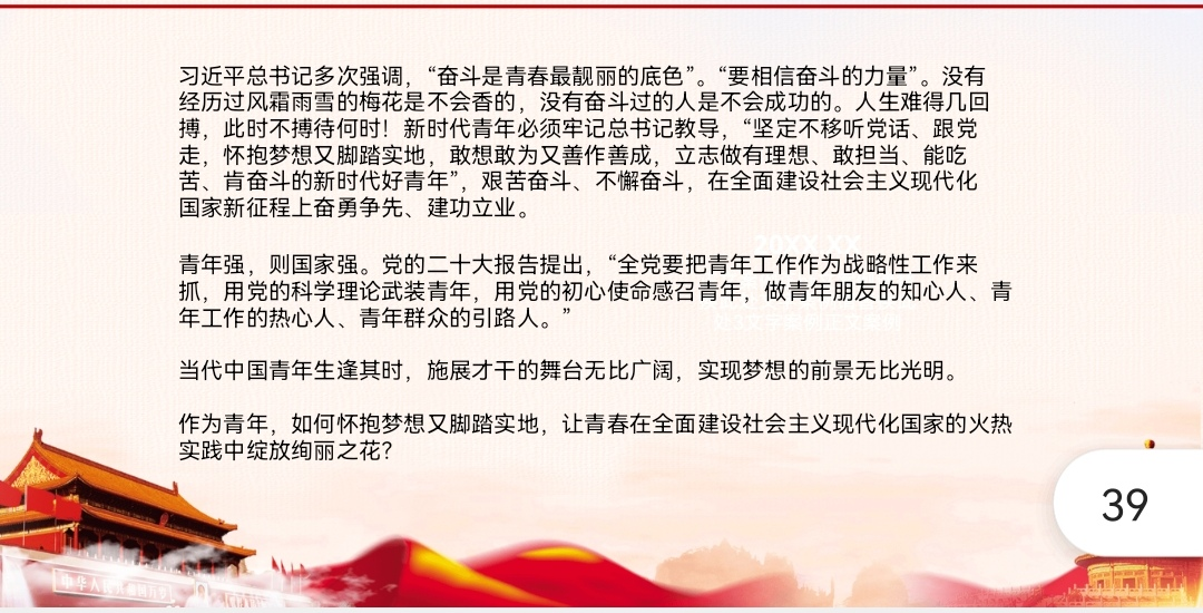 会议最后,用习近平总书记的发言,来亲切鼓励广大青年坚定理想信念,筑牢精神之基,厚植爱国情怀,矢志不渝跟党走,以实现中华民族伟大复兴为己任。