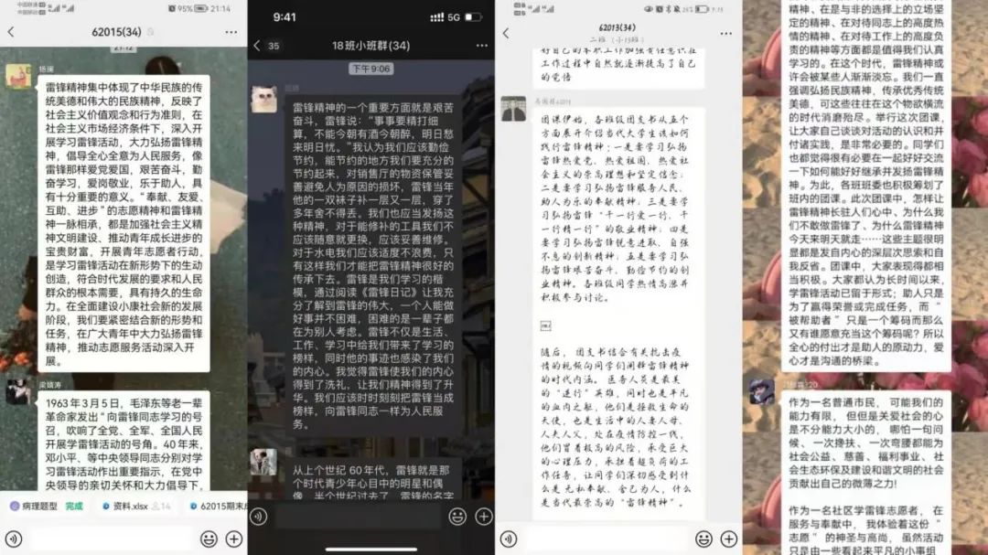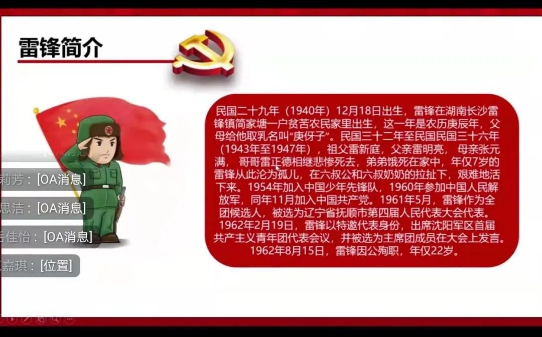 “学习雷锋好榜样,忠于革命忠于党,爱憎分明不忘本,立场坚定斗志强......”我们从小传唱的学习雷锋好榜样在我们心中铭心刻骨。雷锋,为人民服务的典型,曾感动了一代中国人。3月5日为“学雷锋纪念日”,是号召广大人民向英雄战士雷锋学习,传承其乐于助人、无私奉献的精神。为响应学雷锋的号召,弘扬雷锋精神,践行雷锋事迹,将雷锋精神的种子播种在校园的每一个角落,3月4日晚9点,护理62011-20班在钉钉平台上开展了“弘扬雷锋精神,树校园新风”主题团课,辅导员赵艳老师及全体同学参与。