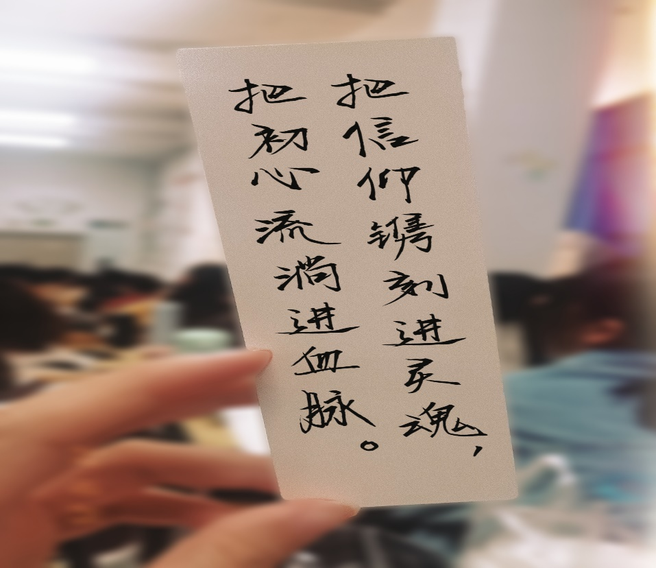 此次活动主要分三个阶段进行,第一阶段是前期的准备阶段,活动负责人提前准备好爱国爱党红色经典书签和卡片,然后在这些书签和卡片上写下了关于党的二十大精神学习的一些小问答及励志话语,旨在通过这样的趣味活动的方式进一步加深同学们对党的二十大的了解,以励志话语鼓励同学们奋发向上。第二阶段是随机藏匿书签和卡片,活动负责人将书签和卡片分别藏匿于教室不同的角落,然后下发通知至班级,鼓励同学们积极寻找,旨在让同学们在娱乐中学习党的二十大知识,感悟会议精神。第三阶段是答案的收集与后期宣传阶段,抽到问题的同学以微信消息的形式交回答案,同时把抽到的问题的图片交回用以装饰教室文化栏。