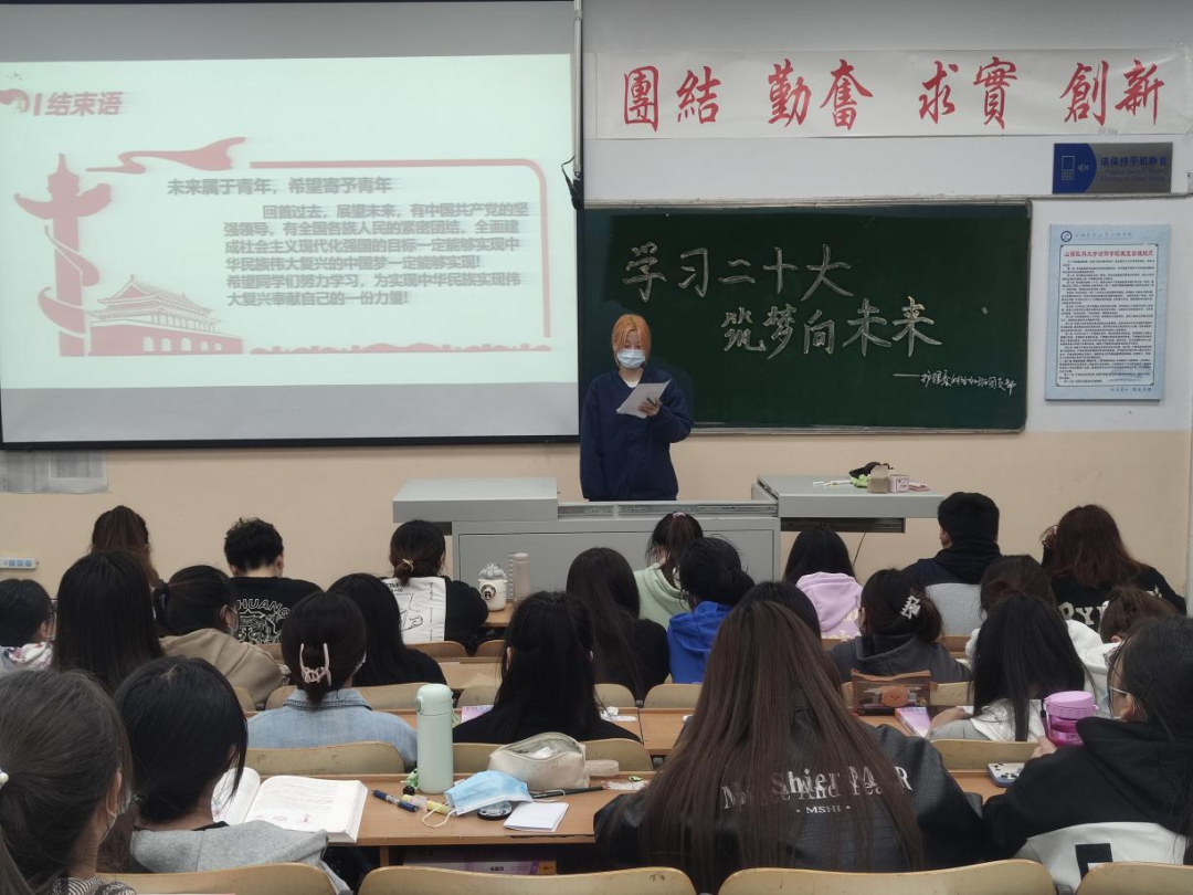 百年征程波澜壮阔,百年初心历久弥坚。前进的号角已经吹响,壮丽的事业激励着我们继往开来。宋鑫雨同学带领同学们共同回顾了党的二十大的主要内容:过去十年我们党做了什么?未来要做什么?要坚持和加强党中央集中统一领导,坚持不懈用新时代中国特色社会主义思想凝心铸魂。2012年至2022年,十年砥砺奋进,中国共产党给中国人民交出了彪炳史册的时代答卷。从党史看,这是矢志不渝践行初心使命的十年;从新中国史看,这是滚石上山走向"强起来"的十年;从改革开放史看,这是全面深化改革不断向广度和深度进军的十年;从社会主义发展史看,这是展现马克思主义真理日新月异的国家,亿万满怀信心的人民欣逢盛世,不胜感怀。我国国际地位不断提高,国际事务话语权不断提升,人民群众的获得感,幸福感不断提升,“我们生在红旗下,长在春风里,人民有信仰,国家有力量,民族有希望,目光所至皆为华夏,五星闪耀皆为信仰。愿以吾辈之青春,捍卫盛世之中华”是我们这一代青年人的心声。