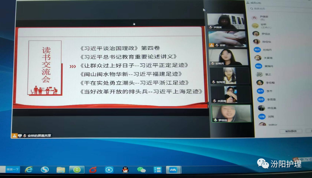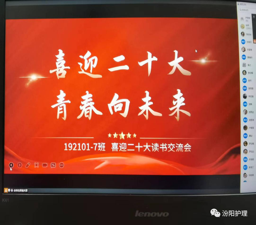 为迎接党的二十大胜利召开,鼓励同学们在学习马克思主义中国化最新成果中坚定理想信念,护理学系助产学192101-7班于10月14日19时许开展了线上读书交流会。辅导员尹国荣老师,192101-7班大班班委以及全体入党积极分子参加了此次交流会,会议由1921班团总支书记闫宇萱主持。