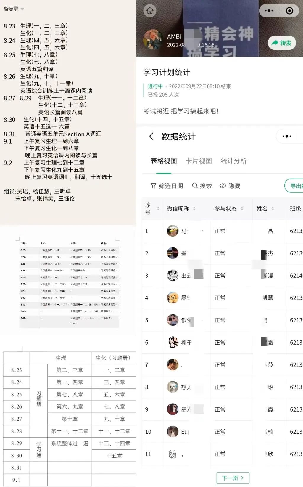 本次活动分为制定学习计划、实施学习计划、检查学习成果、检查结果与反馈四个部分。同学们以个人或组队的形式参与活动,经过统筹思考作出对自己、对班级负责的学习规划,有效促进班内同学间的互帮互助。有了学习规划,可以大幅度地提高同学们的自主学习能力,以“云自习室”这种全新的方式进行学习,是一种挑战也是一个机遇。同学们自由安排时间进行打卡学习,突破了固有死板的学习模式,也有效改善了同学们在家散漫无章的生活态度,云自习打卡学习这种方式看似没有人监督实际上却处处有痕迹可查的,着实为当下疫情在家学习中的有力帮手。