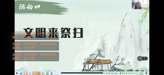 最后主持人成浩平围绕“文明祭扫”主题,倡导大家自觉摒弃不文明的祭扫方式,做文明祭祀的践行者和带头人,将中华民族慎终追远的情感融入现代文明的表达方式。同学们积极讨论,发表了自己对于文明祭祀的见解。37班柴蕾表示我们要做到绿色祭扫,杜绝污染,提倡以献一束花,敬一杯酒,植一棵树等文明方式寄托哀思,将祭拜先人的传统习俗用更加环保、健康、文明的方式进行表达。36班刘雪柯表示可以采取新形式进行祭扫,如网上祭扫,家庭追思书等追思故人,寄托思念,不搞封建迷信,告别祭扫陋习,营造文明祭奠新风尚。