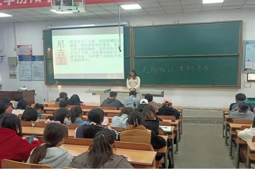 首先,孙燕龙同学讲述了香烟的组成成分及其危害。吸烟致癌,吸烟是导致肺癌的首要危险因素;吸烟可以引发心脑血管疾病,吸烟者由冠心病引起的猝死要比不吸烟者高四倍以上;吸烟对智力也有损害。世界卫生组织将吸烟列为全球流行病,并认为烟草是目前对人类健康最大的威胁。其次,孙燕龙特意将吸烟与未吸烟的肺进行鲜明对比,指出香烟对肺的危害。最后孙燕龙以一个视频向同学介绍“长期吸烟的人身体会发生的变化”。此次班会旨在帮助同学们走出吸烟的误区,认识到吸烟的害处和戒烟的益处,从自身做起,树立吸烟危害自己及他人的健康理念,养成良好的健康卫生习惯和文明生活方式。