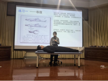 史素婷老师以通俗易懂的语言阐述了脊椎的复杂构造与重要功能,结合一些临床流行病学调查数据与高清脊椎模型,生动展示了长期伏案学习、低头玩手机、不良睡姿等行为如何悄然损害脊椎健康,引发如颈肩疼痛、腰椎间盘突出、脊柱侧弯等病症。同时,在预防与康复指导环节,史老师强调了在日常生活活动中保持“脊柱中立位”的重要性,并详细传授了多种实用方法,从保持正确的坐姿,如应在久坐时采用挺胸结合骨盆前倾的坐姿策略;到合理站姿,避免圆肩和伸下巴,找到腰背肌松弛的“开关”;再到科学睡姿,选择合适枕头床垫以维持脊椎自然曲线等;另外,还推荐了“快走”的锻炼方式以预防和减轻脊柱疼痛。最后,史素婷老师还介绍了一些提高脊柱稳定性的运动处方并进行了演示,如改良式的卷腹、侧桥、‘鸟狗式’等动作,鼓励同学们日常坚持锻炼,强化脊椎周围肌肉力量,增强脊椎稳定性。在互动环节,同学们积极配合老师在现场做一些简单的脊柱测试动作,来判断自己的脊椎是否健康。